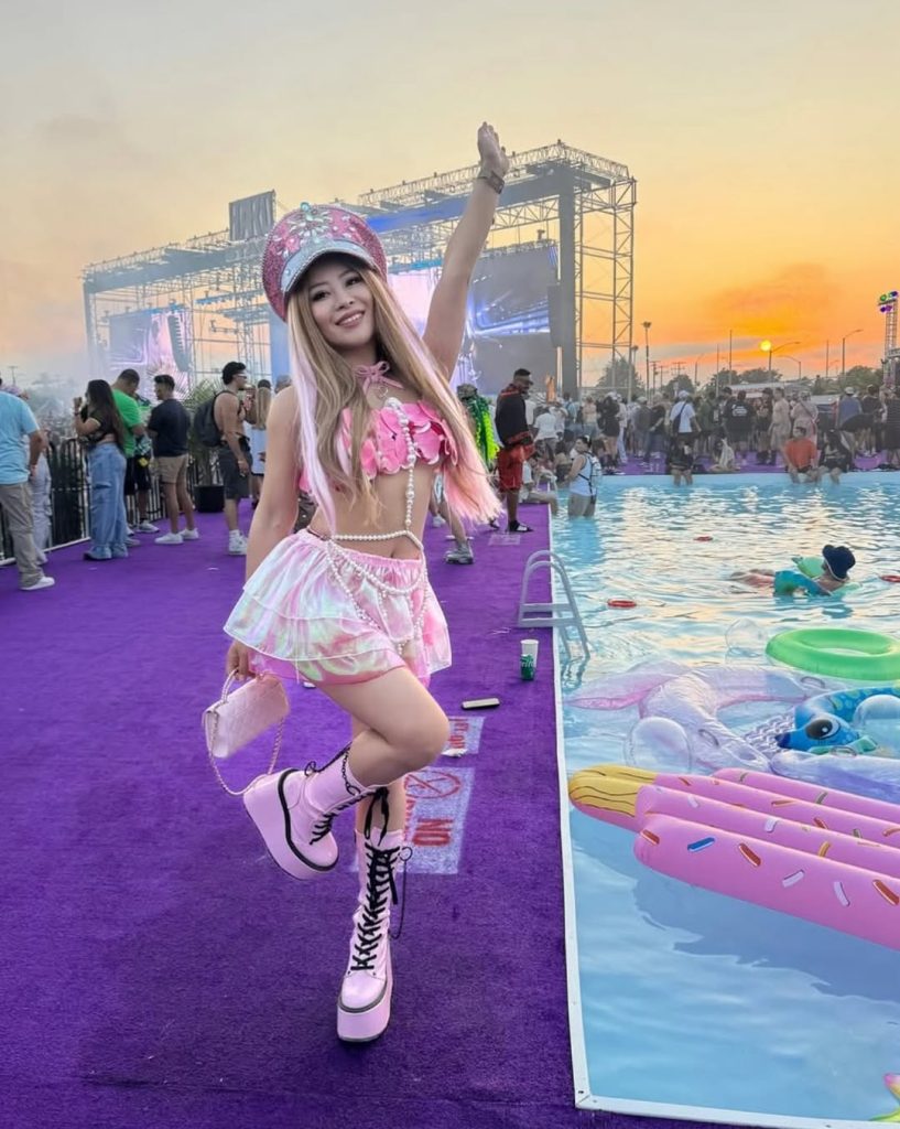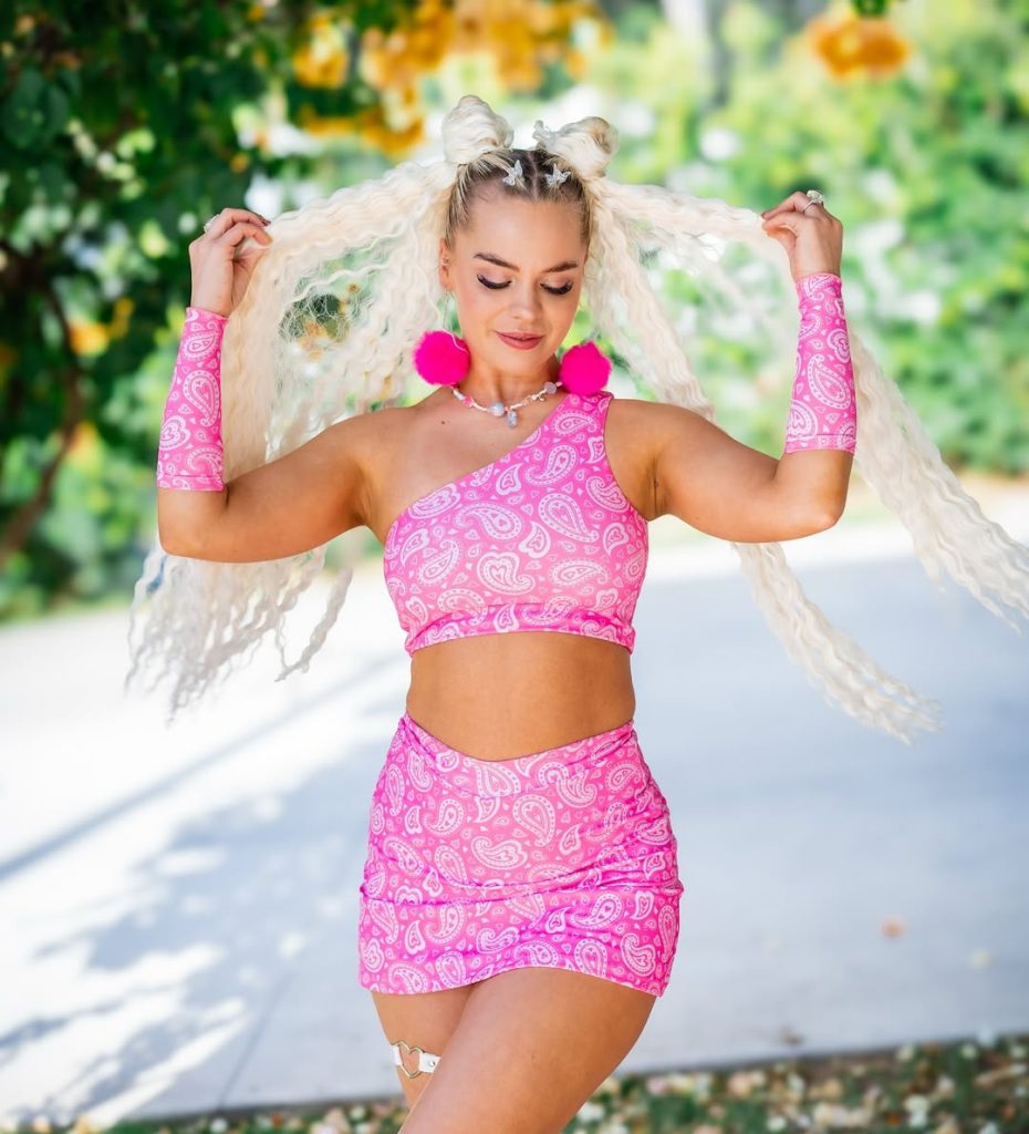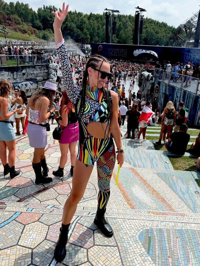 This bright pink paisley set brings such joyful energy—the kind that instantly puts you in festival mode the moment you step outside. Paired with colorful accessories and voluminous textured hair, the whole look radiates playful confidence. It’s bold without being overwhelming, cute without losing its edge, and totally in tune with the rave and EDM spirit that defines so many 2026 events. There’s a carefree happiness in the styling that feels irresistible, especially under sunny skies.