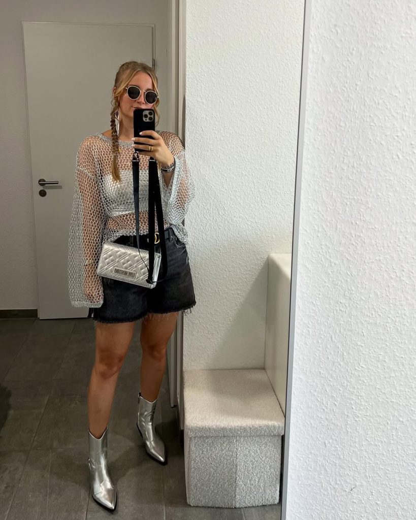 The silver boots are what truly set this look apart. They turn simple denim shorts into a full 2026 trends moment, adding height, personality, and a little bit of country music charm. The metallic crossbody keeps everything hands-free so you can enjoy the festival without thinking about your bag, making the whole look both stylish and practical.