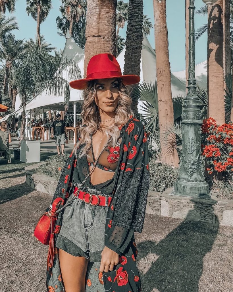 This outfit brings such beautiful boho energy—soft, feminine, and full of personality. The red hat instantly sets a confident tone, like a woman who knows exactly what she wants from a festival day. The floral kimono floats with every step, adding drama without overwhelming the look, and the sheer top underneath brings a subtle rock-inspired edge that keeps it from feeling too sweet.
