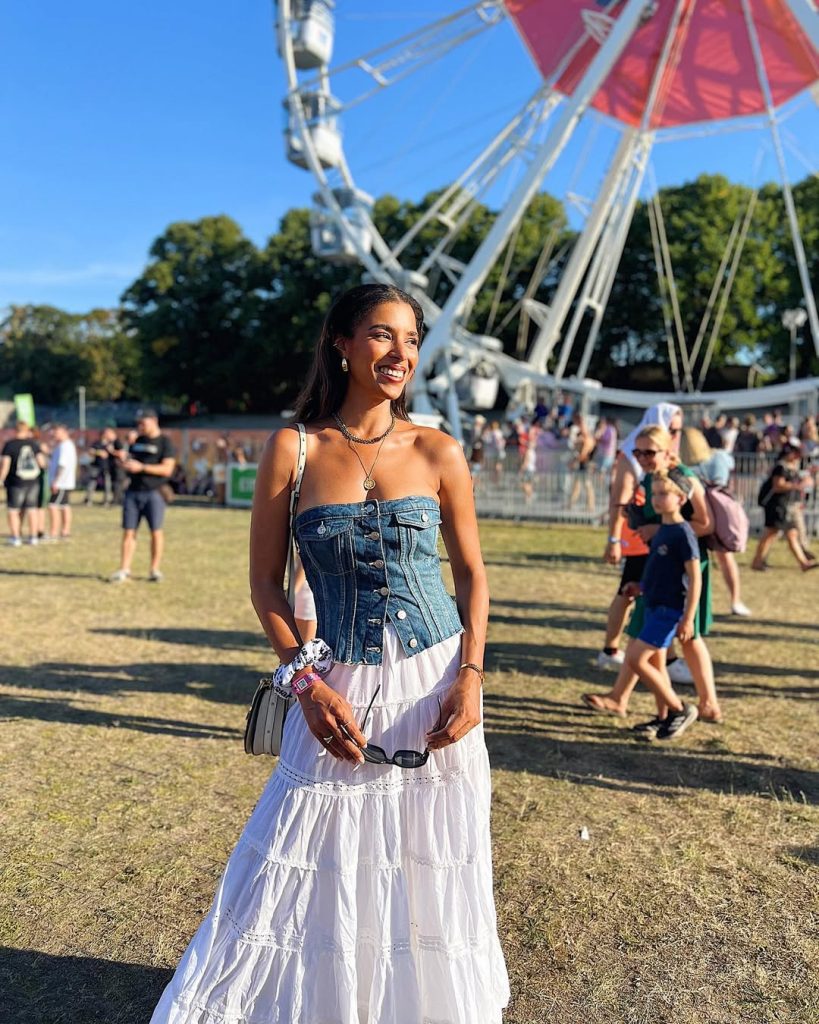 Soft and romantic, this look feels like summer light captured in an outfit. The denim corset adds structure and a hint of Western influence—almost a quiet nod to country—while the long white skirt moves with a breezy, beach-inspired flow. It’s the kind of festival outfit that feels comfortable, flattering, and naturally photogenic from morning to sunset.