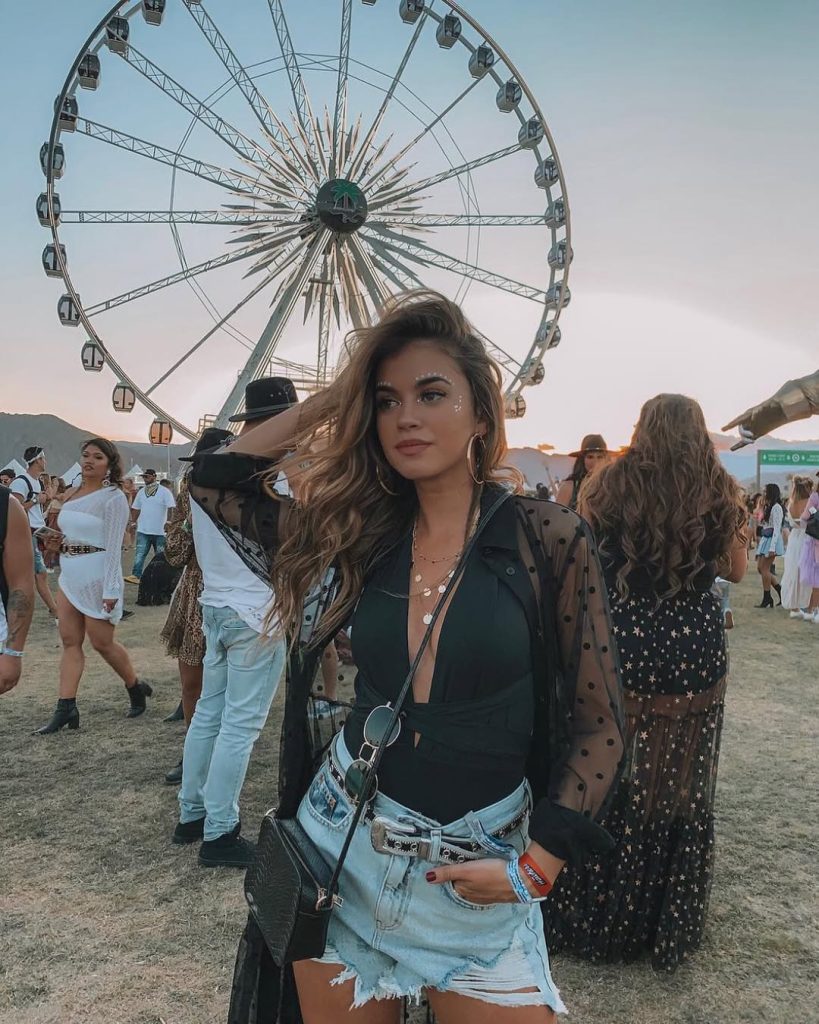This look captures that effortless, laid-back festival charm—simple pieces styled in a way that still feels elevated and cool. The one-shoulder black bodysuit adds a modern twist, while the denim shorts keep things casual and easygoing. It’s the kind of outfit that works for those moments when you’re just wandering between stages, catching glimpses of music and conversations, soaking in the easy happiness that festivals bring. There’s a soft confidence in this look that feels very in line with 2026’s relaxed festival mood.
