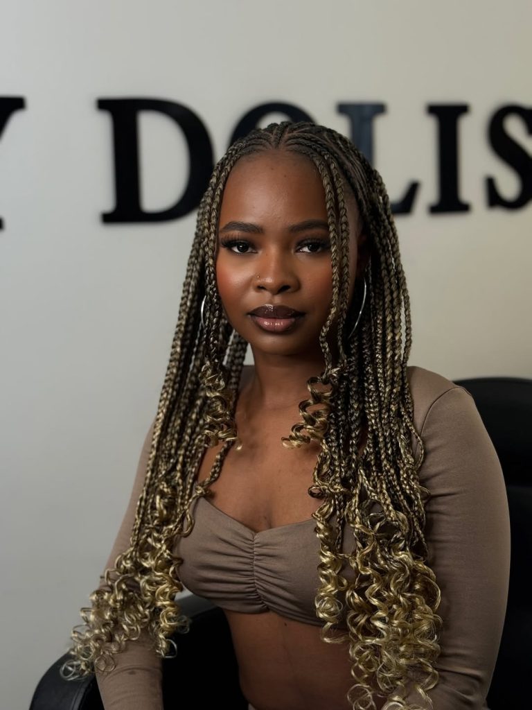 Ideal for designs with weaves or with curls, this look flatters most face shapes and enhances natural hair textures. Moisturize with a light curl cream to maintain softness, and wrap the braids gently at night to protect the color blend. It’s trendy yet wearable, perfect for women who love effortless beauty with cultural depth.