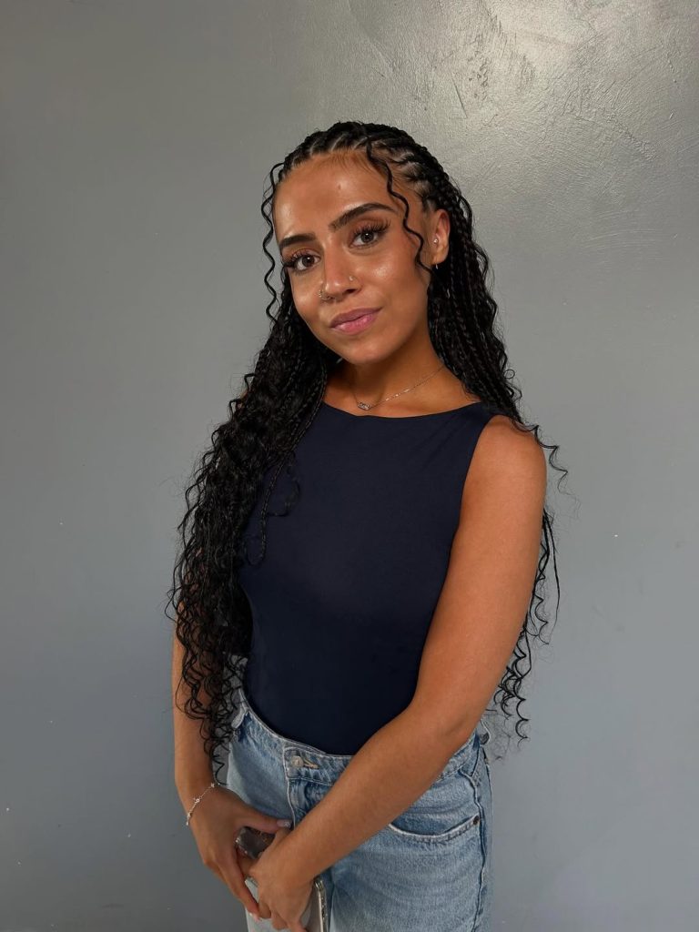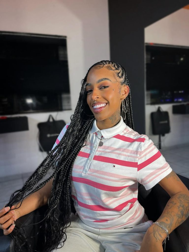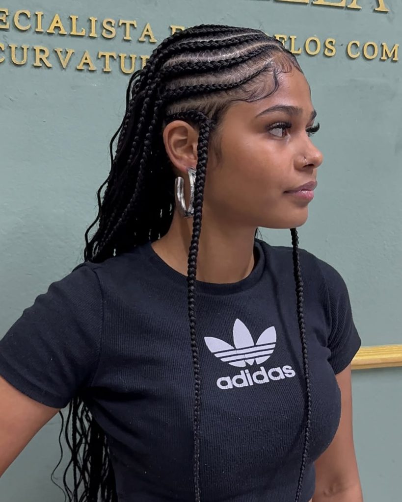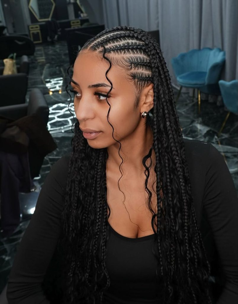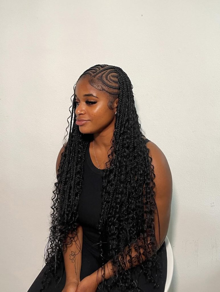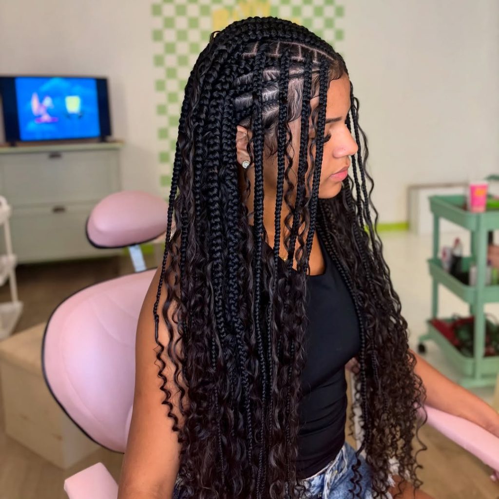 Perfect for natural hair 4c or those who prefer designs with natural hair, this style brings out texture without compromising manageability. It’s especially flattering for women who love long braids but want a bit of movement and flow. Style with mousse or a light curl refresher to keep the curls hydrated and bouncy. Whether paired with hoop earrings or a bold lip, it gives major confidence energy in 2026.