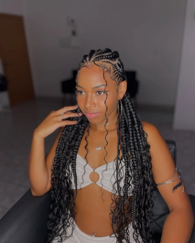 This style exudes confidence and a carefree attitude. Long, wavy Fulani braids transition into relaxed, flowing wavy curls that give off a beachy vibe, while the design is sleek and structured around the scalp. The swooped baby hairs and curled parting pattern give a modern, artistic touch to the style. This is great for women who want a design that feels expressive and spirited and gives attitude.