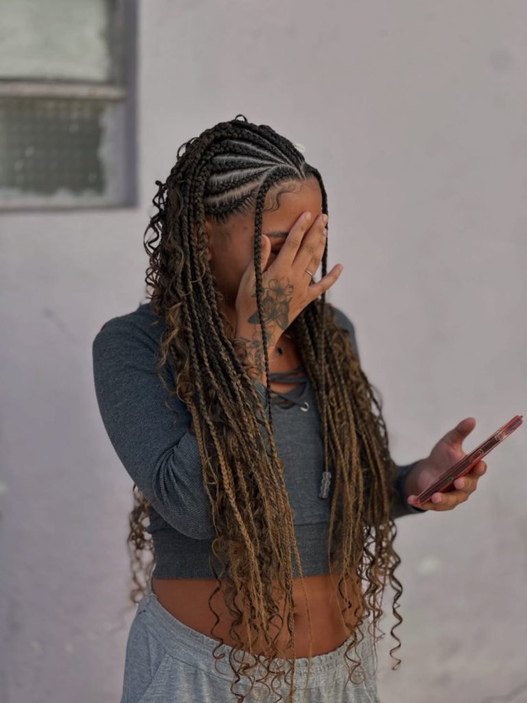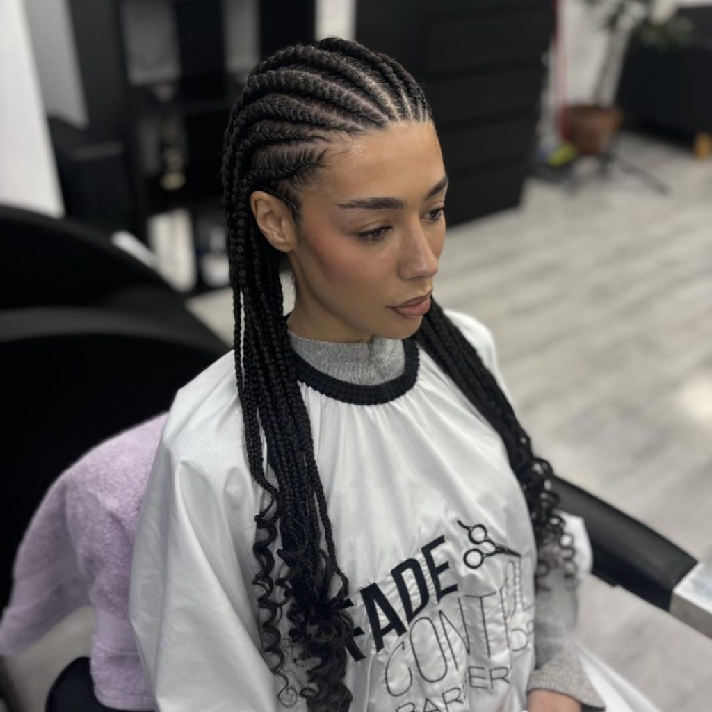 These Fulani braids radiate energy and confidence, with bold curls and precisely styled baby hairs that add personality to every strand. The intricate cornrow pattern brings structure, while the free-flowing curls soften the look. It’s a style that perfectly balances boldness and femininity—eye-catching without ever feeling overdone.