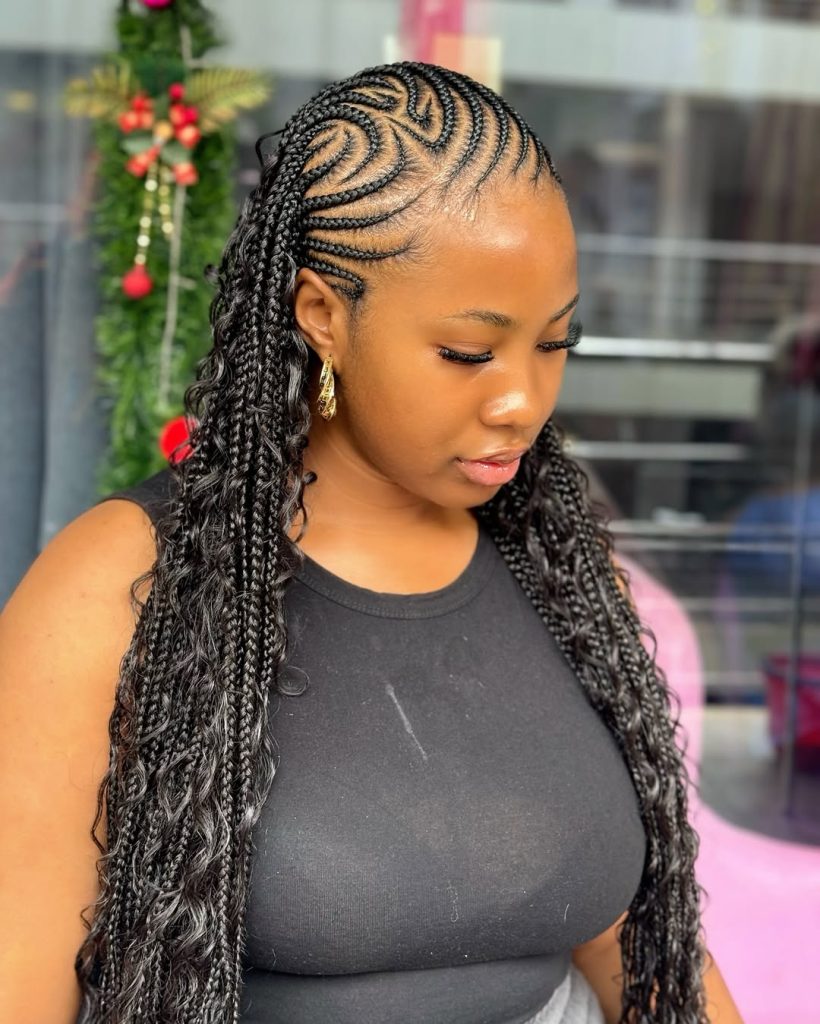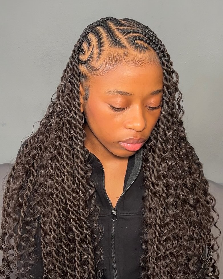 This hairstyle is great for anyone who loves designs with curls or twist details. It’s particularly flattering on natural hair and easy to maintain with minimal effort. Keep the curls soft with mousse and protect the braids with a silk bonnet at night. It’s a 2026-ready look that blends tradition, artistry, and everyday wearability with effortless flair.