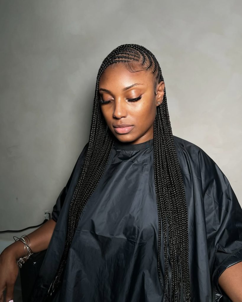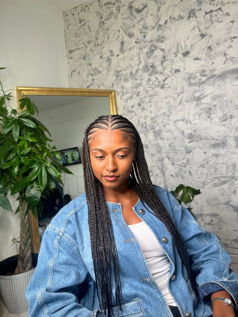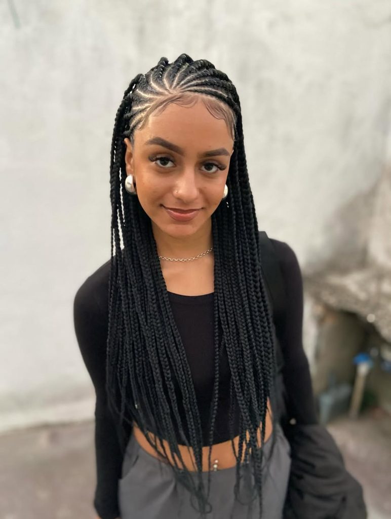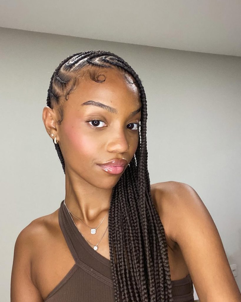 This design suits women with fine or medium hair who appreciate low-maintenance beauty. The long braids are easy to style—wear them down, tie them into a ponytail, or wrap them in a bun for a more polished finish. It’s perfect for anyone wanting designs without curls but still craving that sleek, modern edge. Lightweight and protective, this is a go-to style for both busy weeks and relaxed weekends.