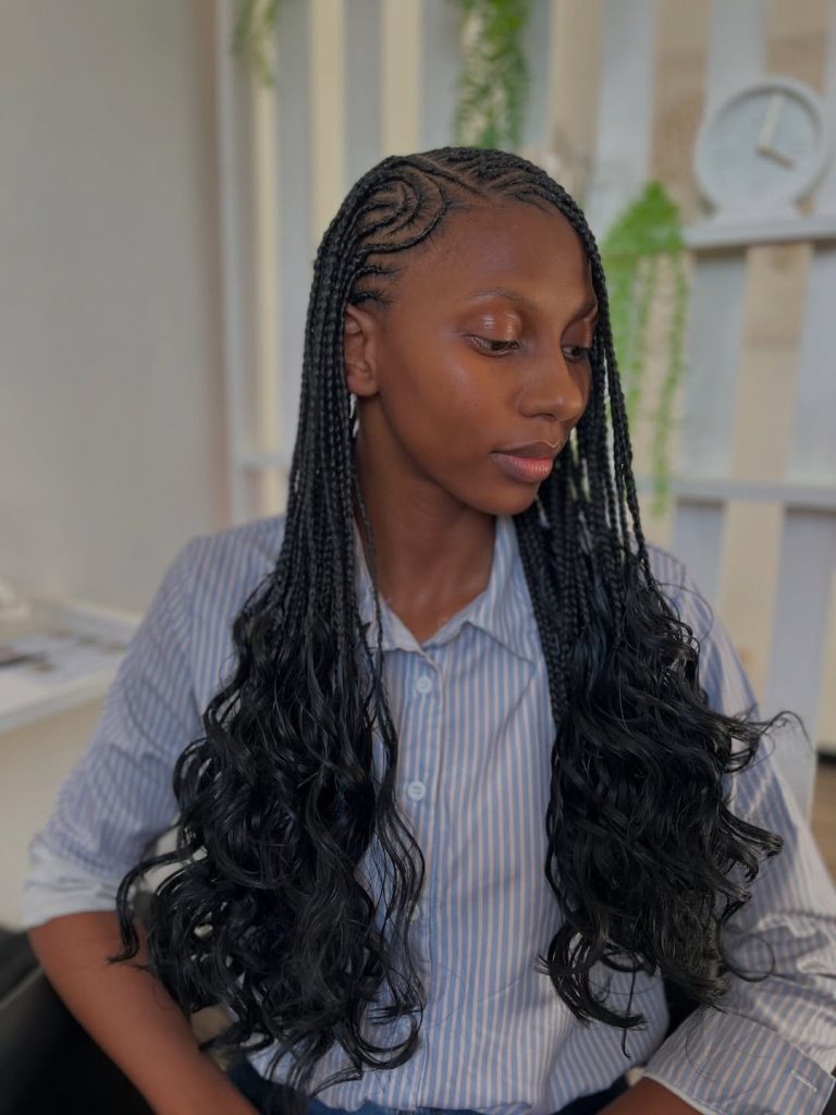 This design is pure artistry—spiral Fulani braids transitioning into long, loose twists that add incredible texture. The pattern feels sculptural, almost hand-drawn, while the soft curls at the ends bring a touch of romance. It’s creative, expressive, and full of movement—the kind of look that turns heads without saying a word.
