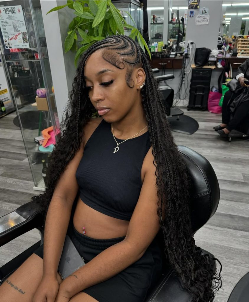 This look blends traditional Fulani artistry with a touch of high-fashion flair. The deep side cornrow pattern draws attention instantly, giving a soft asymmetrical silhouette that highlights cheekbones and facial features. The long braids paired with defined curls at the ends create an effortlessly chic contrast—a style that feels both bold and feminine, full of personality and grace.