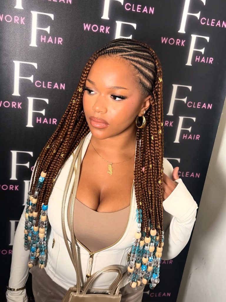 If you’re looking for boho designs with a modern twist, this one’s for you. It’s flattering on medium to thick textures, especially if you like experimenting with color. Use edge control to maintain a smooth finish and a little shine spray to enhance the braids’ luster. The beads aren’t just decorative—they bring rhythm, energy, and a sense of individuality to your overall look.