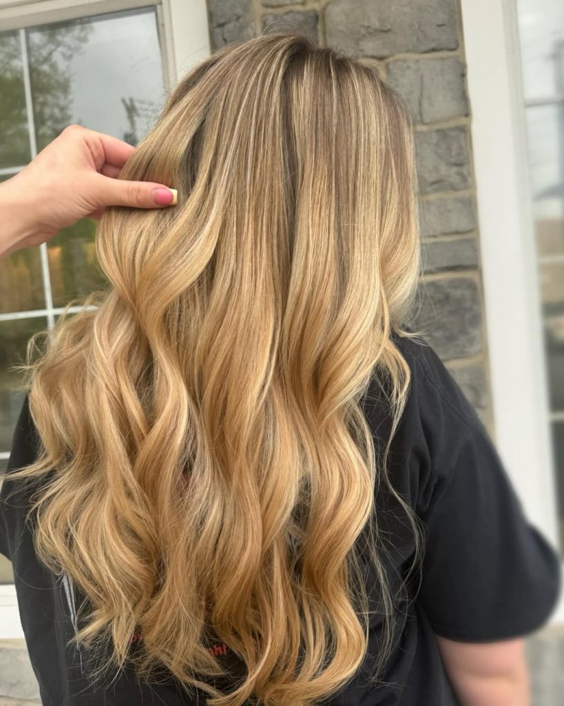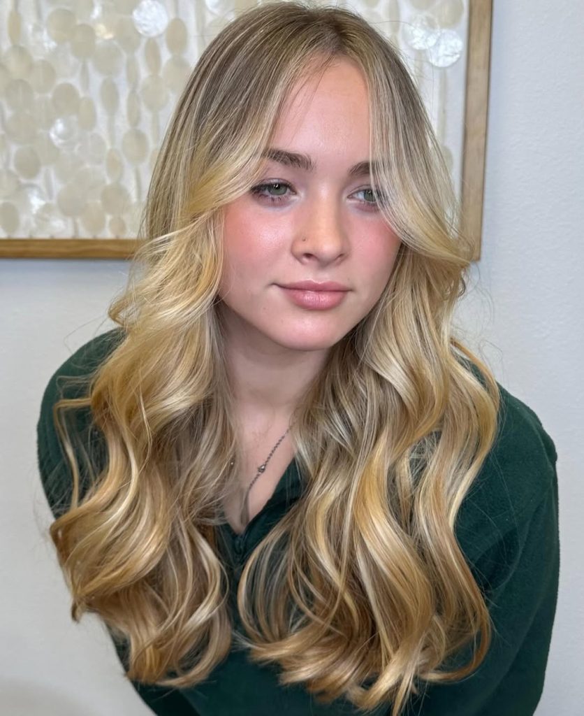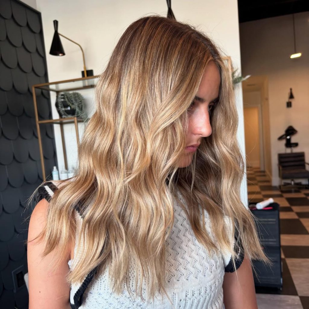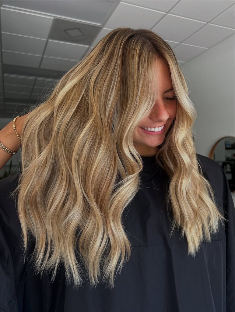 This glamorous golden blonde look shows just how transformative balayage can be. The deeper base melts seamlessly into lighter ends, creating richness and dimension that’s impossible to ignore. The cascading waves add drama and movement, making the whole style feel red-carpet ready. It’s a confident, head-turning look that radiates sophistication while keeping a natural vibe.
