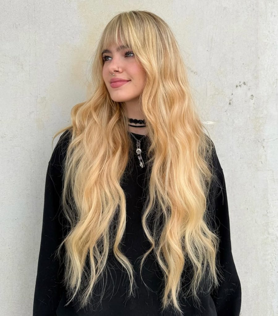 18. Long Golden Blonde with Feathered Bangs