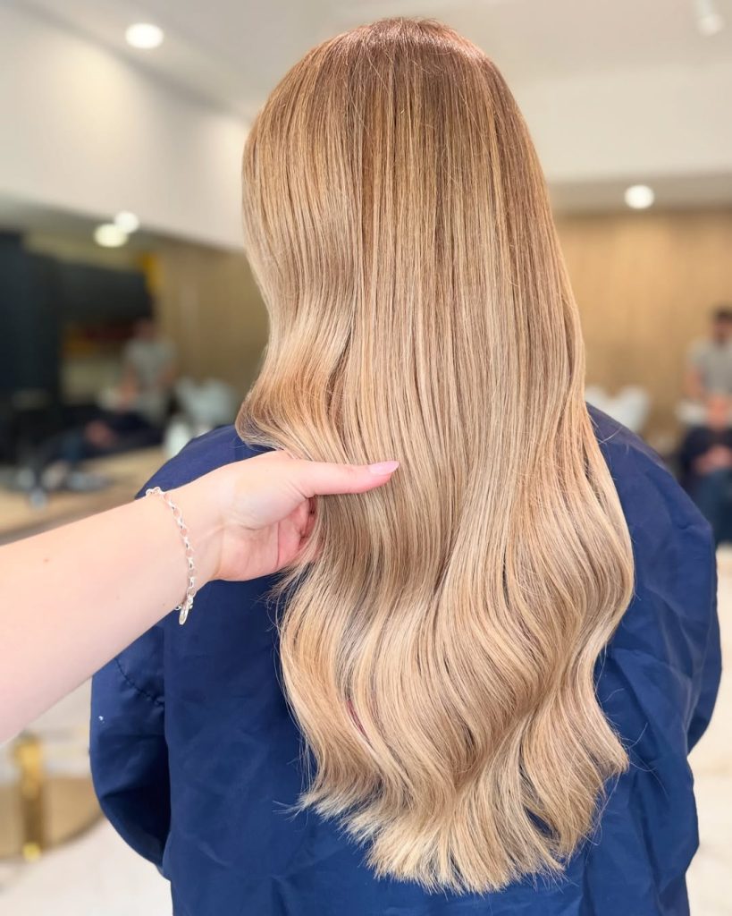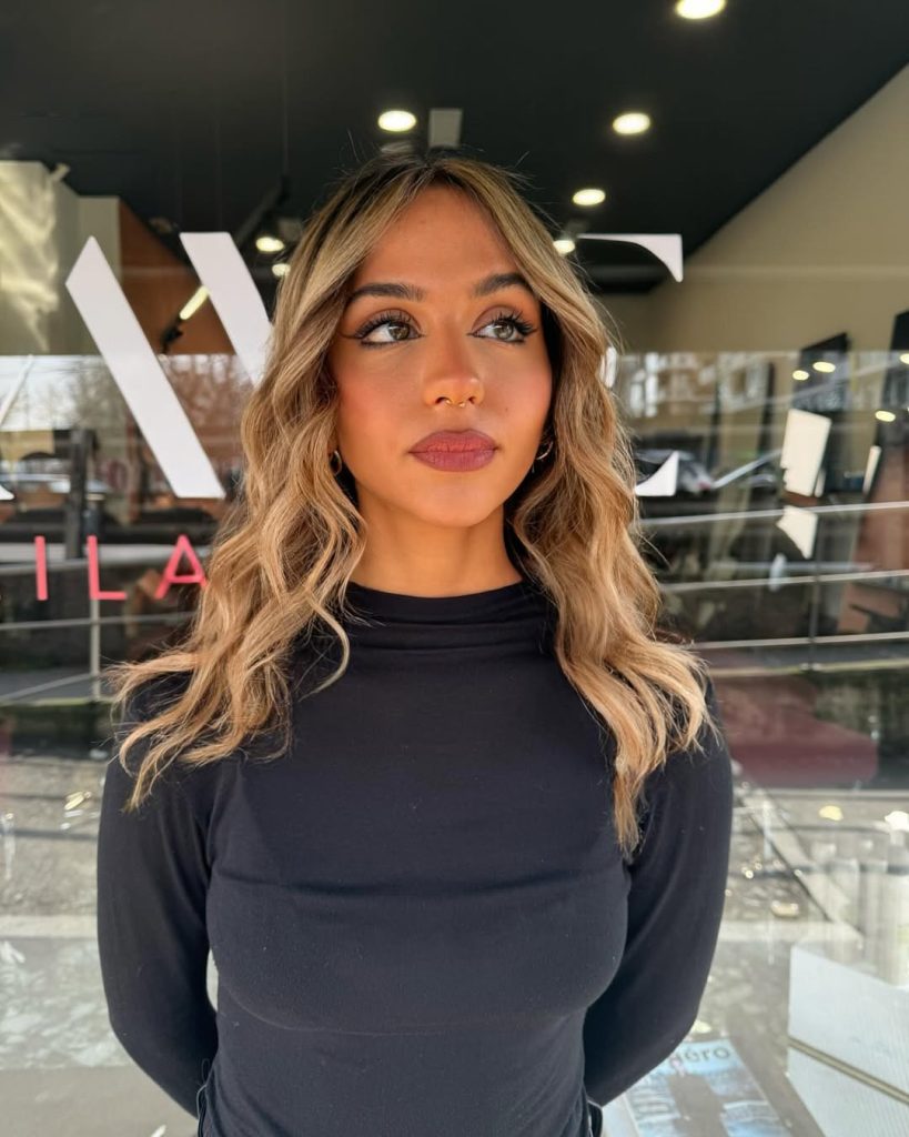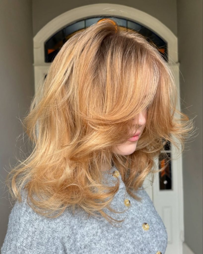 Medium-length golden blonde strikes a perfect medium between polished and casual. Soft waves amplify the subtle nuances of the colour, where warm honey tones blend gracefully with lighter pieces. It’s radiant but not in-your-face, that kind of style that silently beautifies your everyday look.
