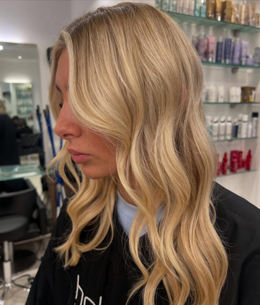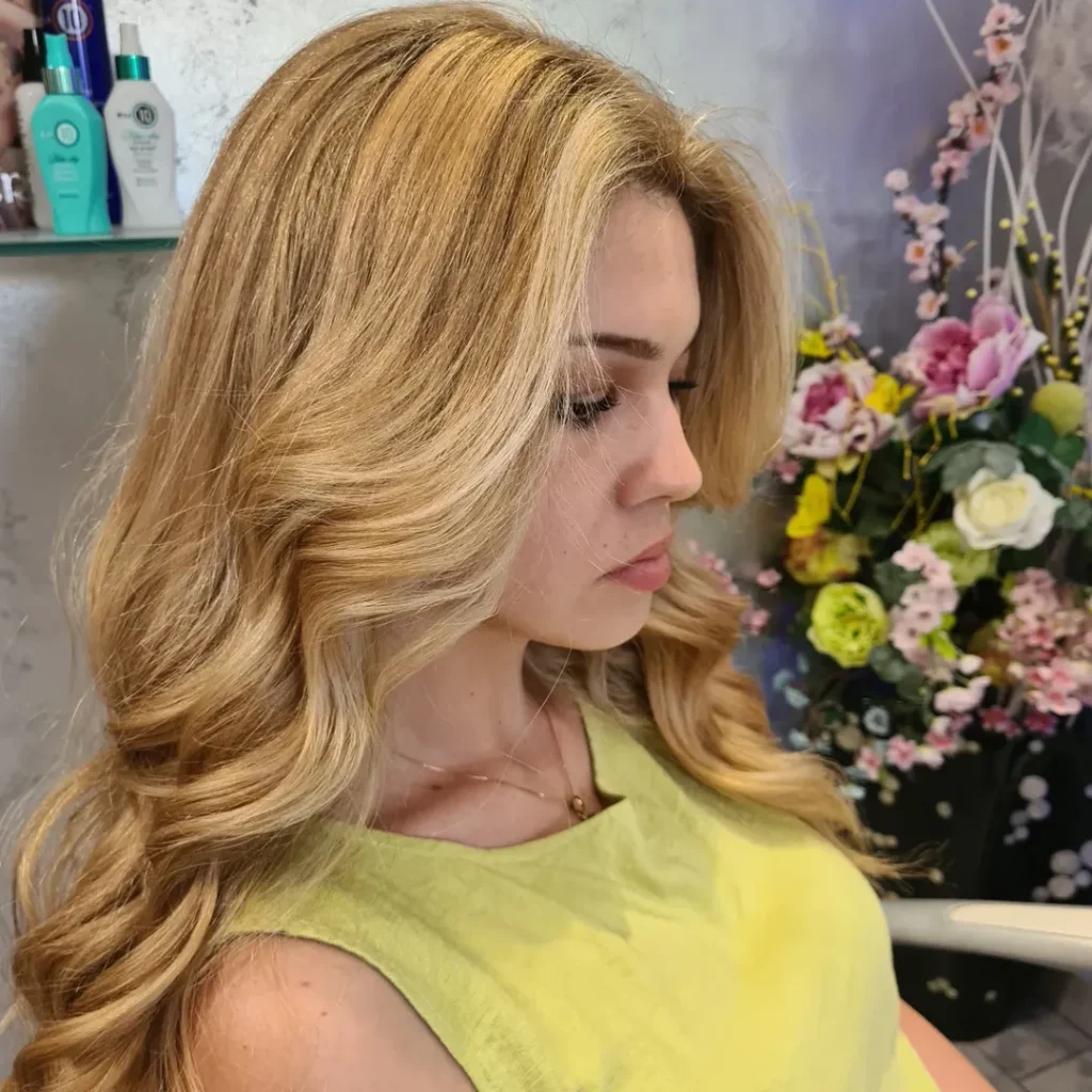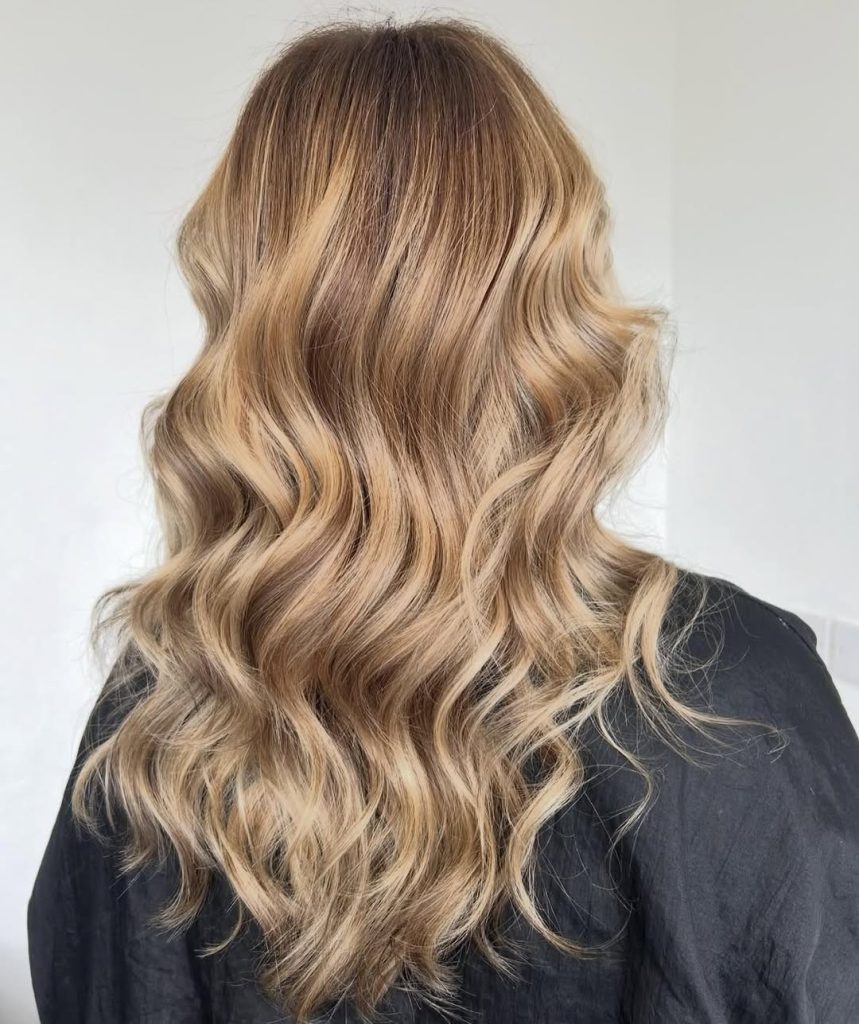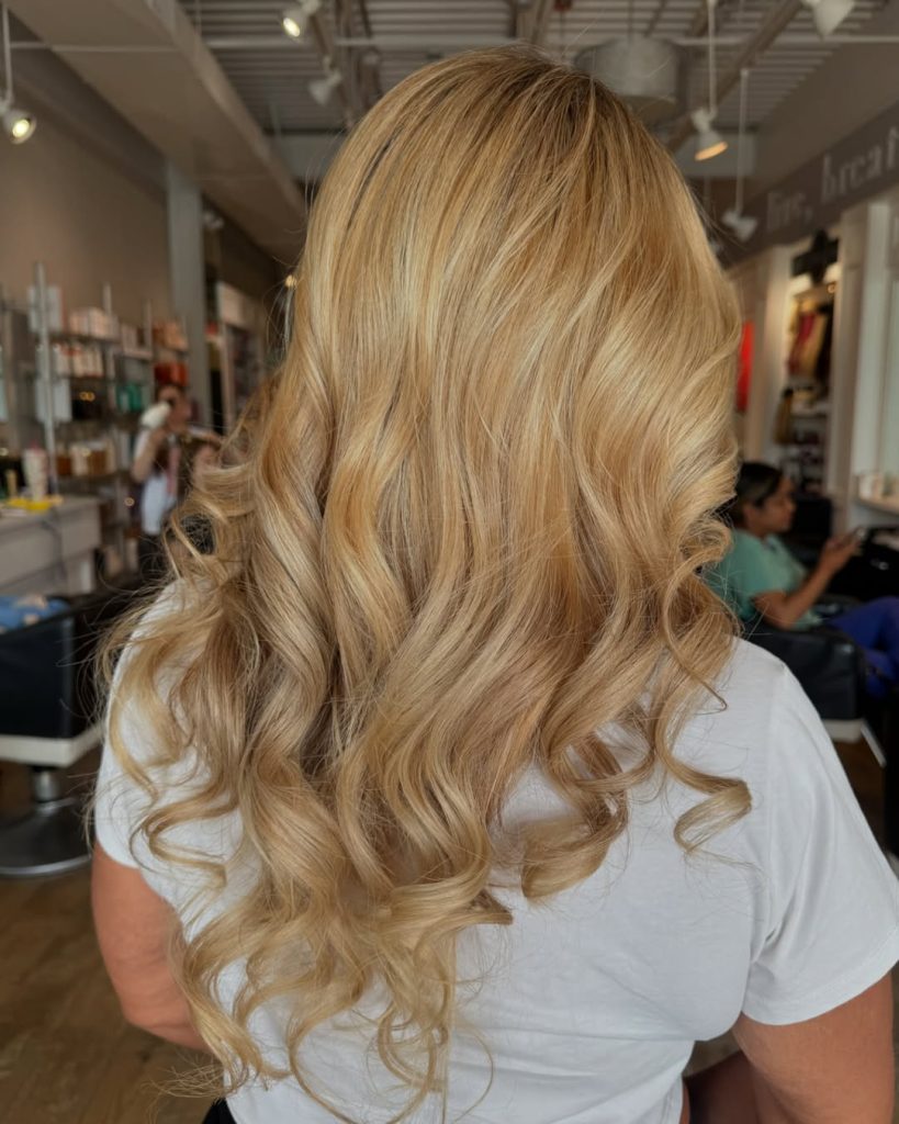 Soft and romantic, these golden blonde curls fall gracefully, creating volume and body. The mix of warm sandy tones with lighter pieces makes the hair look full of depth and dimension. It’s glamorous but wearable, the kind of style that can be dressed up or down effortlessly.