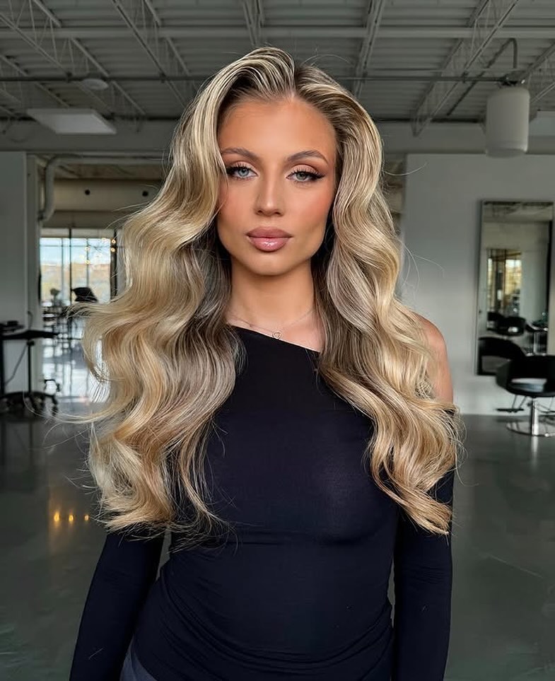 Golden blonde waves with a Hollywood touch can add instant glam to any look. A center part establishes symmetry as the waves undulate in smooth, glossy, and timeless shapes. The interplay of lighter and darker shades adds depth, elevating the style and making it multidimensional.