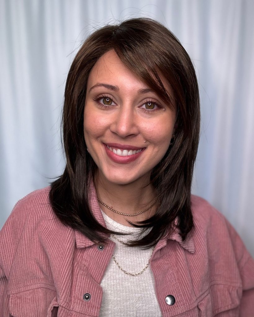 This style has a youthful quality without appearing overly juvenile. The long, flowing hair with the wispy bangs gives a lightness to the look that is relaxing and modern. It is excellent for feeling polished and confident while being styled to fit your everyday life.