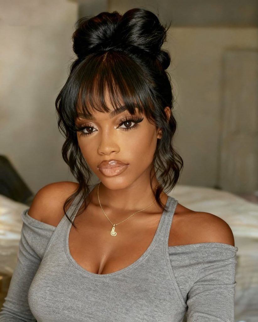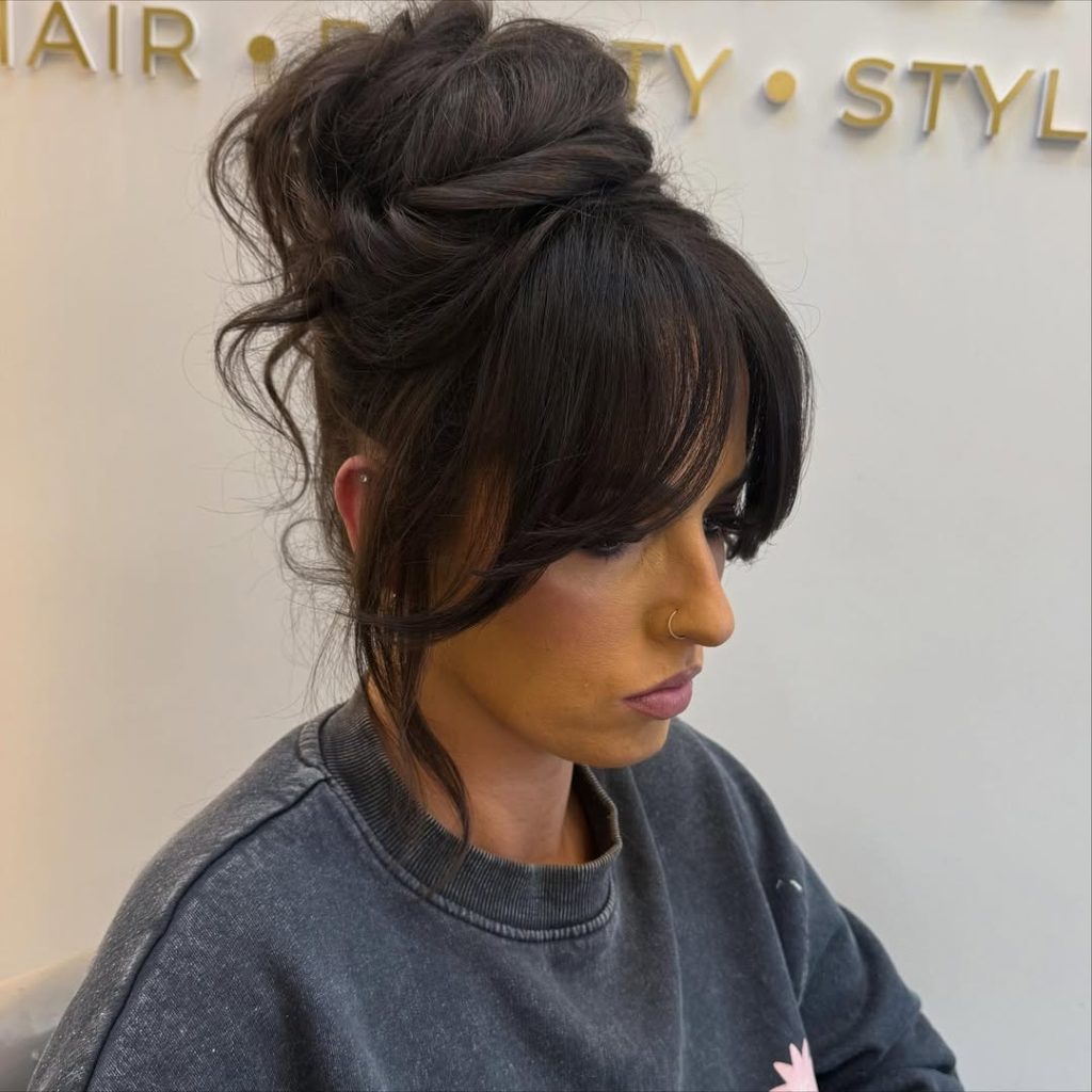 This hairstyle instantly feels like an occasion. The lifted updo paired with soft bangs creates a graceful balance between structure and softness. It has a timeless charm that feels perfect for meaningful celebrations, whether you’re attending a wedding or stepping into a formal evening feeling confident and seen. The bangs soften the face and add a romantic touch that never feels overdone.
