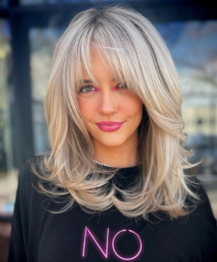 There’s a breezy, fresh energy to this hairstyle that feels instantly uplifting. The long blonde length paired with soft curtain bangs creates an open, glowing frame around the face. It feels modern but approachable, giving off that effortlessly put-together look that works just as well for casual days as it does for dressed-up moments.