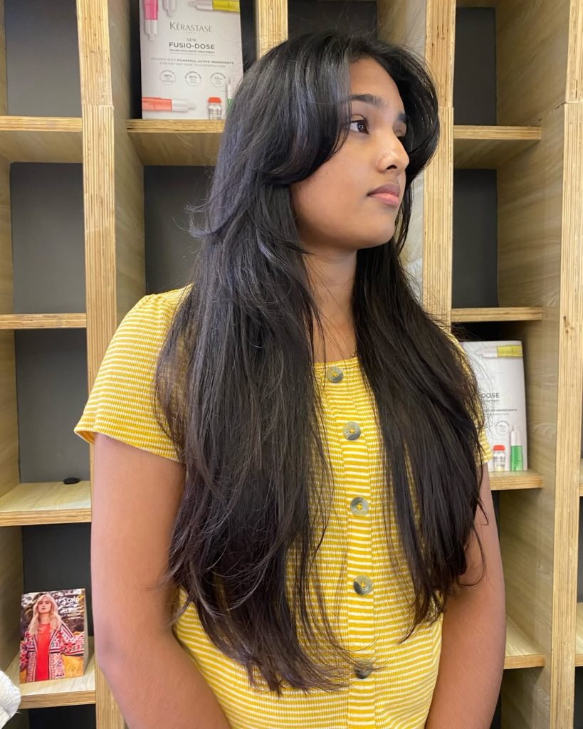 This style is best suited for long hair with straight or softly styled texture. It’s a wonderful choice for women over 50 who love length but want a polished, modern shape. Styling is straightforward with a blow-dryer and smoothing product, making it ideal if you like your hair to look sleek and controlled without a lot of effort.
