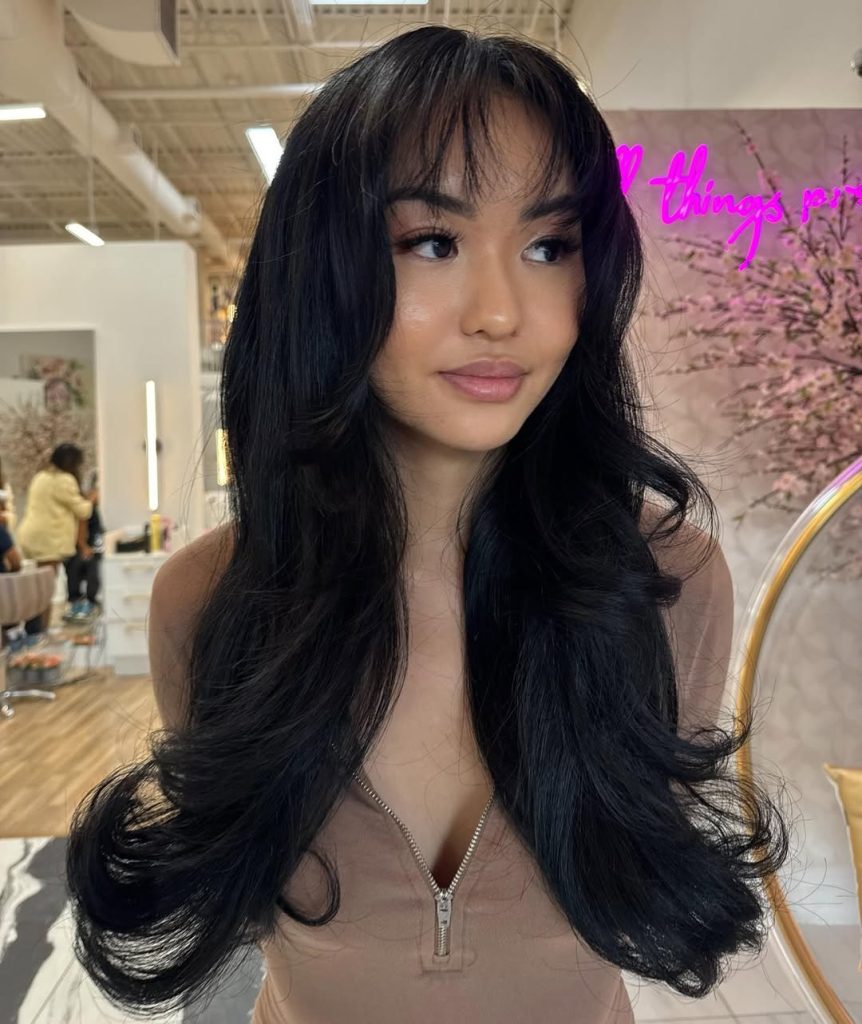 This style feels youthful in the best possible way—not young, but alive. The long, flowing waves paired with airy bangs create a sense of movement that feels confident and feminine. It’s the kind of hairstyle that makes you stand a little taller because it doesn’t hide who you are. The bangs add softness, while the length keeps everything feeling glamorous and expressive.