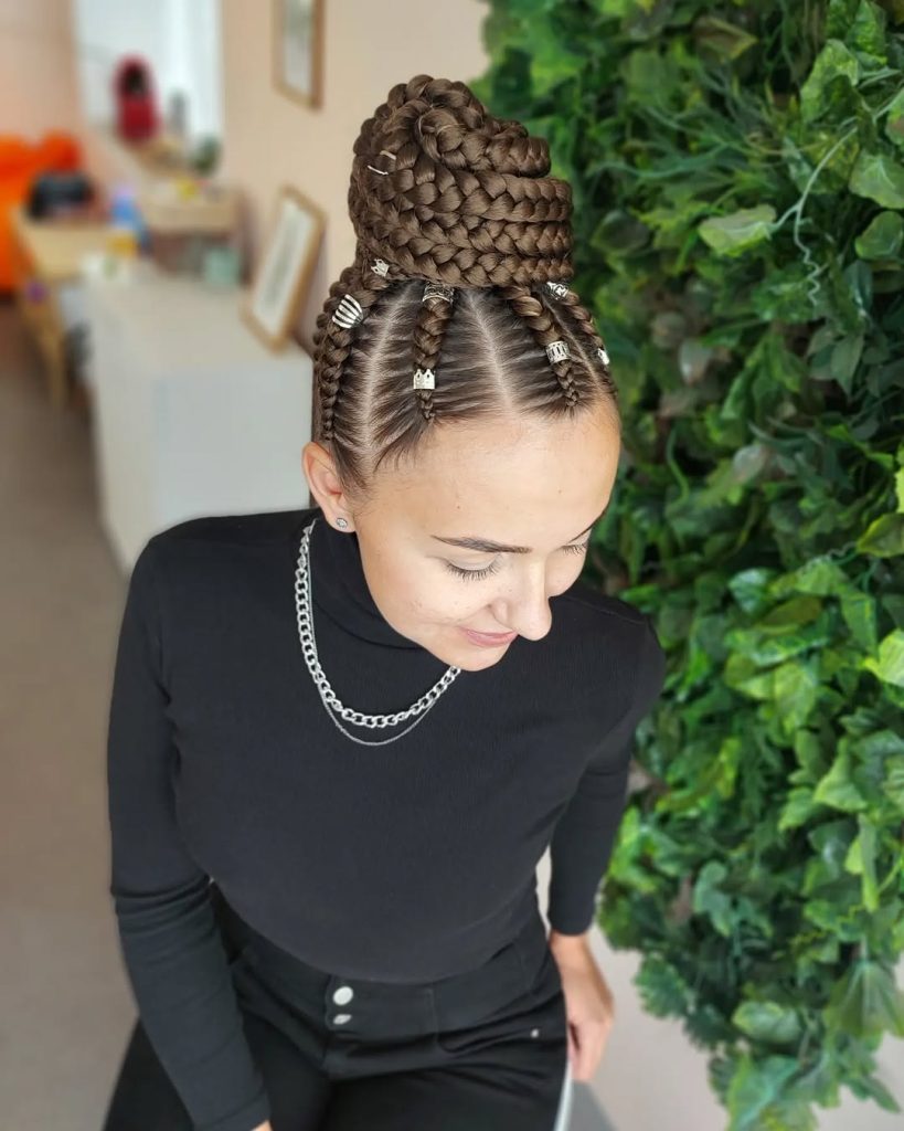 There’s something quietly powerful about this style. The braids are smooth, precise, and lifted into a structured bun that feels intentional without being stiff. It gives the impression of someone who knows her style and doesn’t need to overdo it. This look feels polished, confident, and surprisingly modern, especially for women who want their hair to feel expressive but still grown-up.