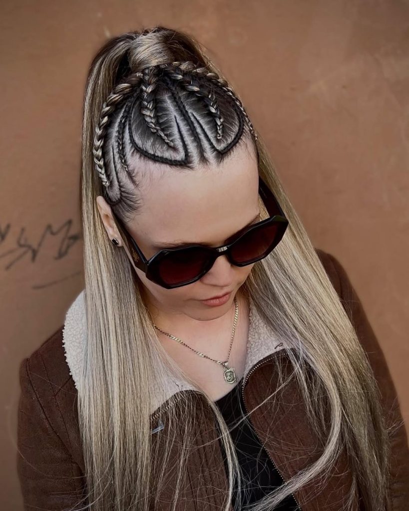 This hairstyle has a striking, confident energy. The contrast between the tight braids and the smooth ponytail creates a look that feels modern and fashion-forward. It’s bold without being overwhelming and gives off a sense of strength and individuality.