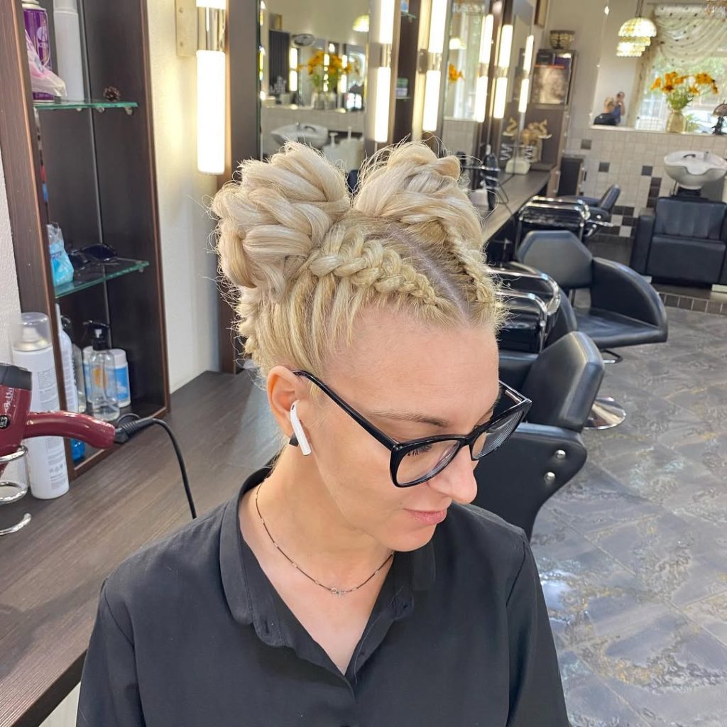 This hairstyle blends playfulness with structure in the best way. The braided double buns sit neatly on top, giving a lifted, youthful feel while still looking intentional and refined. It’s a look that feels confident, organized, and quietly enjoyable.