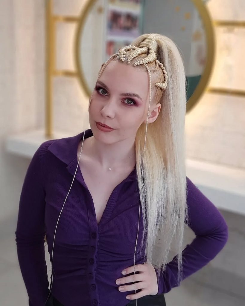 This hairdo feels confident, feminine, and gentle. The elegant sculpted ponytails are made from rose-toned braided hair that adds height, and the warm color keeps the ponytail appearance complacent. For those who appreciate gentle drama and want to avoid intense stiffness, this haircut looks like a perfect option. The slightly warm and elegant appearance makes this option a good fit. The appearance makes them feel special and well put together; this style looks effortlessly on point.