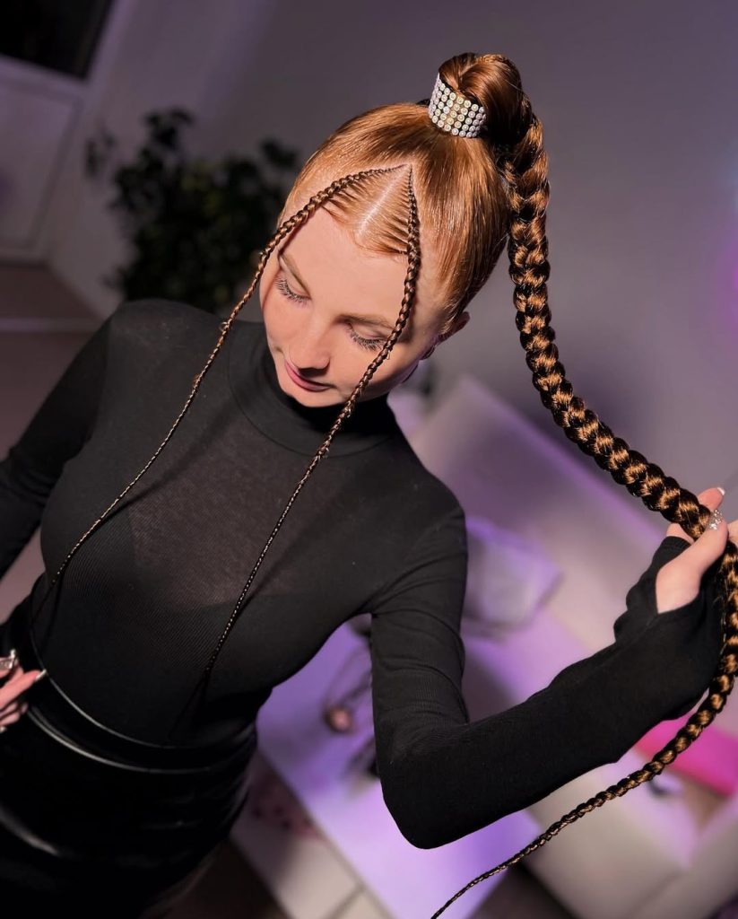 This hairstyle has a bold, confident attitude that feels fresh and energizing. The braided base leads into a dramatic ponytail that moves beautifully and adds height. It’s the kind of look that instantly lifts your posture and your mood, making you feel put-together even on a simple day.
