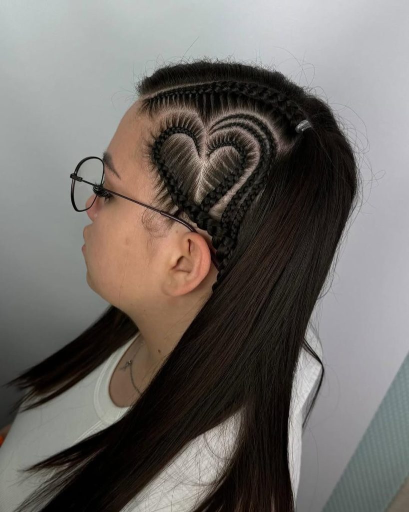 This hairstyle feels playful and expressive, almost like wearing a quiet piece of art. The heart-shaped parting adds personality without feeling childish, and the contrast between the braided design and flowing long sections creates a beautiful balance. It’s the kind of look that makes people lean in a little closer.