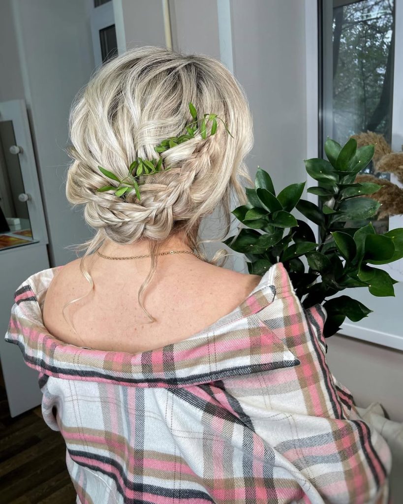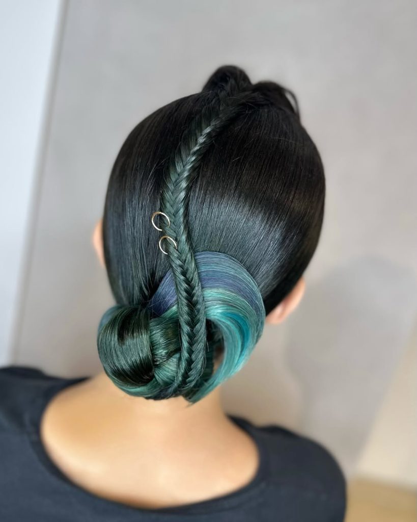 This one looks polished and sophisticated while still being tranquil. The low braided bun is a vintage detail, while the modern color accent woven into the braid pulls the look together. It is perfect for those who are minimalists and want to stay classy.