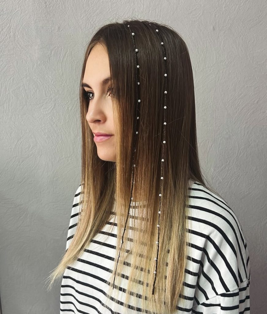 There’s something quietly elegant about this hairstyle. The sleek straight hair creates a clean canvas, while the tiny braided details add interest without overwhelming the look. It feels calm, thoughtful, and understated—perfect for women who appreciate subtle beauty. This style has a soft, everyday charm that feels natural and refined rather than trendy or loud.