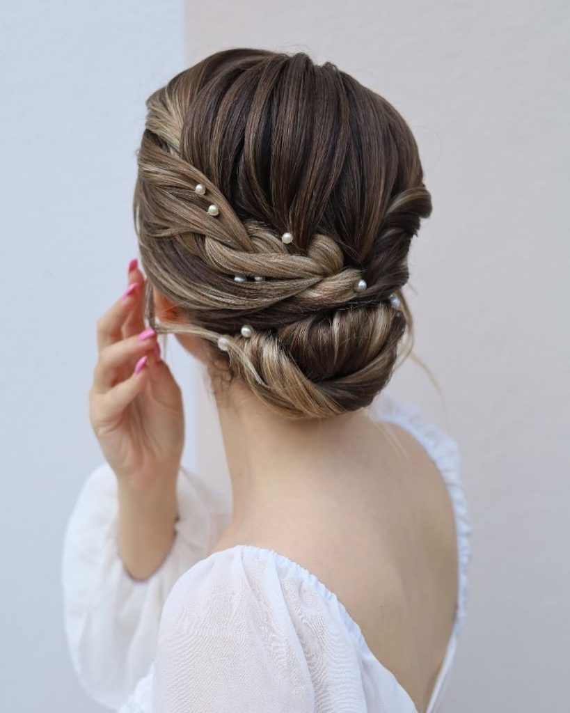 29. Elegant Braided Low Bun with Pearl Accents