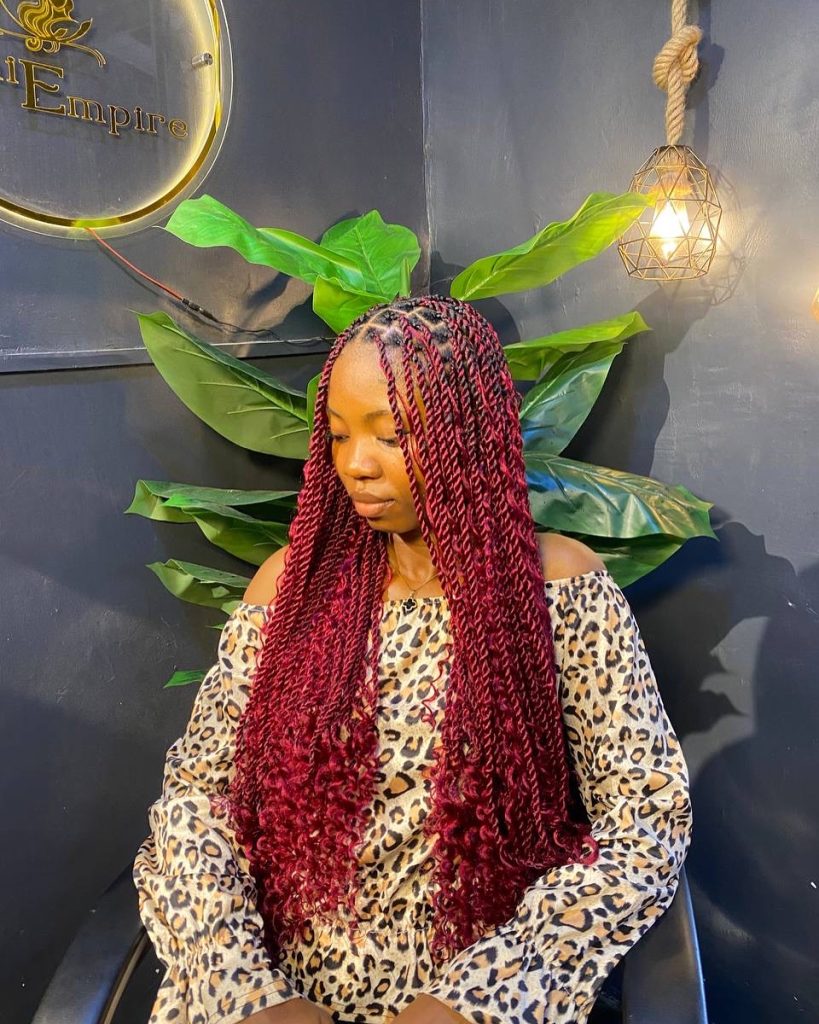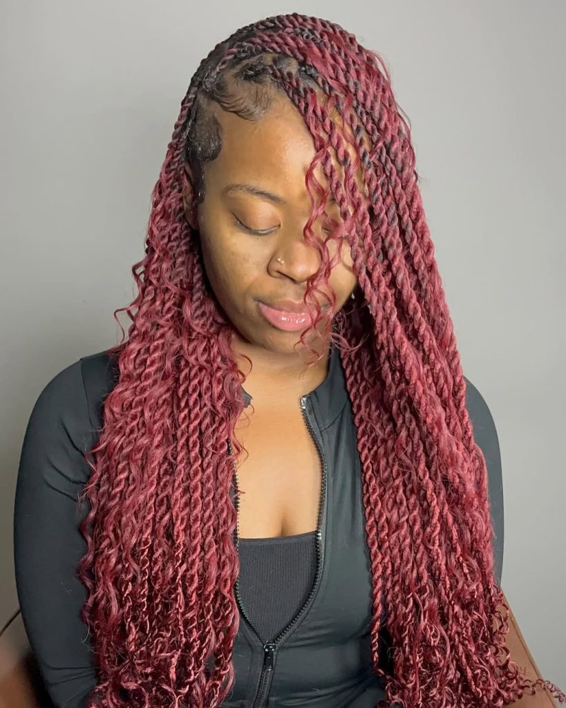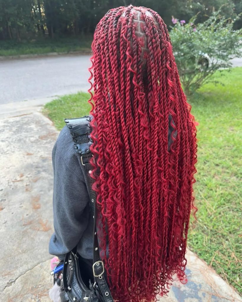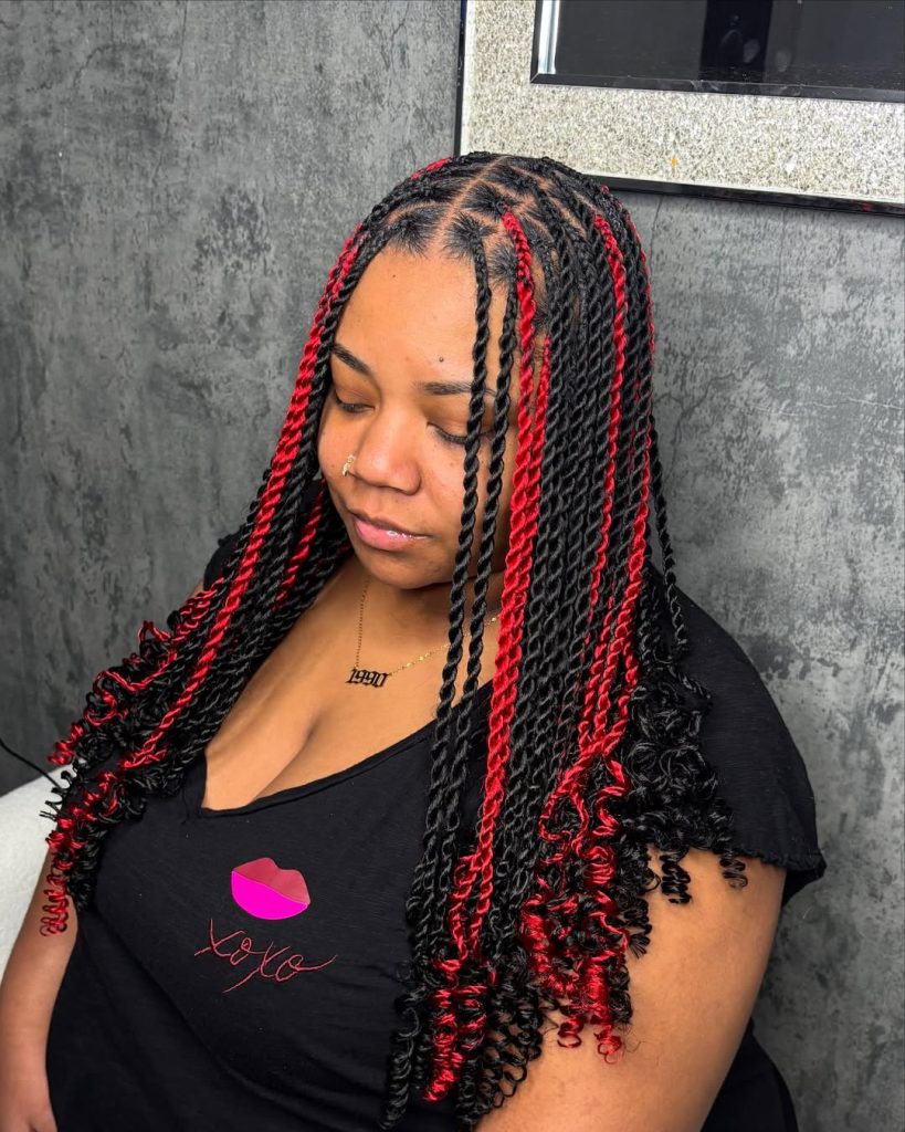 Island twists with red highlights always make a statement, and this version feels especially confident and unapologetic. The contrast between dark twists and bold red strands adds dimension, while the defined ends keep the style polished. It’s a look that feels expressive, strong, and very much alive.