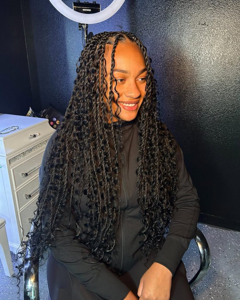 There’s something instantly reassuring about a clean middle part paired with loose, flowing curls. This island twist style feels polished yet relaxed, giving you that “put together without trying too hard” energy. It’s the kind of hairstyle that feels right in any setting—work, weekends, or special moments.
