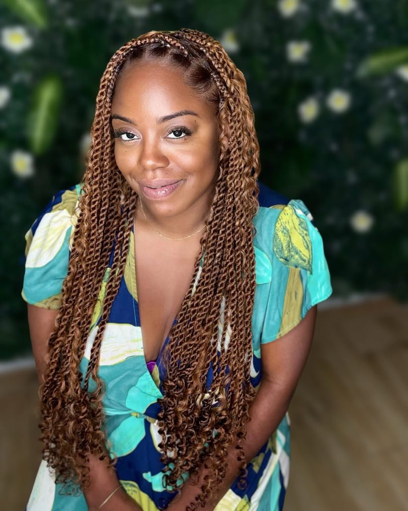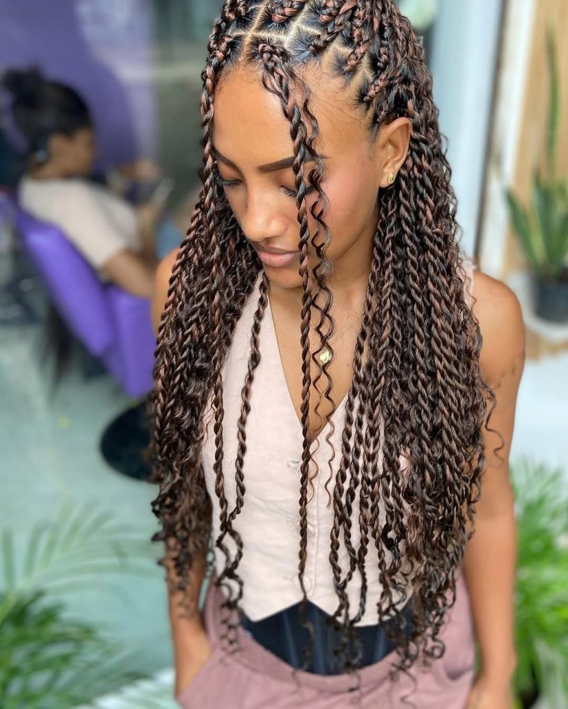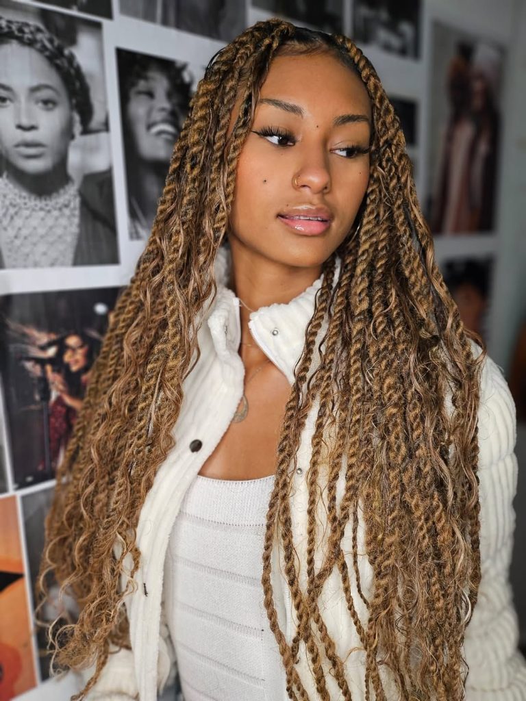 This version of island twists feels relaxed and approachable, with a soft side part that gives the face a gentle lift. It has a casual, almost boho charm that works for everyday life, whether you’re heading to brunch or just enjoying a quiet afternoon. There’s an ease here that feels very real and wearable.