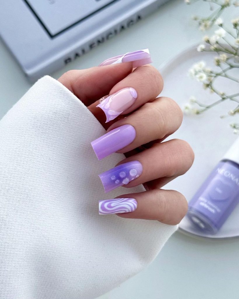 This set evokes the essence of a lavender milkshake, infused with a unique personality. The long, square acrylic shape gives it a bold, structured edge, while the mix of soft purple, translucent pink, and swirling art details keeps it playful. One nail features a dreamy marble swirl, another nail has delicate dots, and the glossy finish ties everything together. It’s expressive, a little dramatic, and absolutely Fun for 2026—the kind of Inspo that turns heads without saying a word.