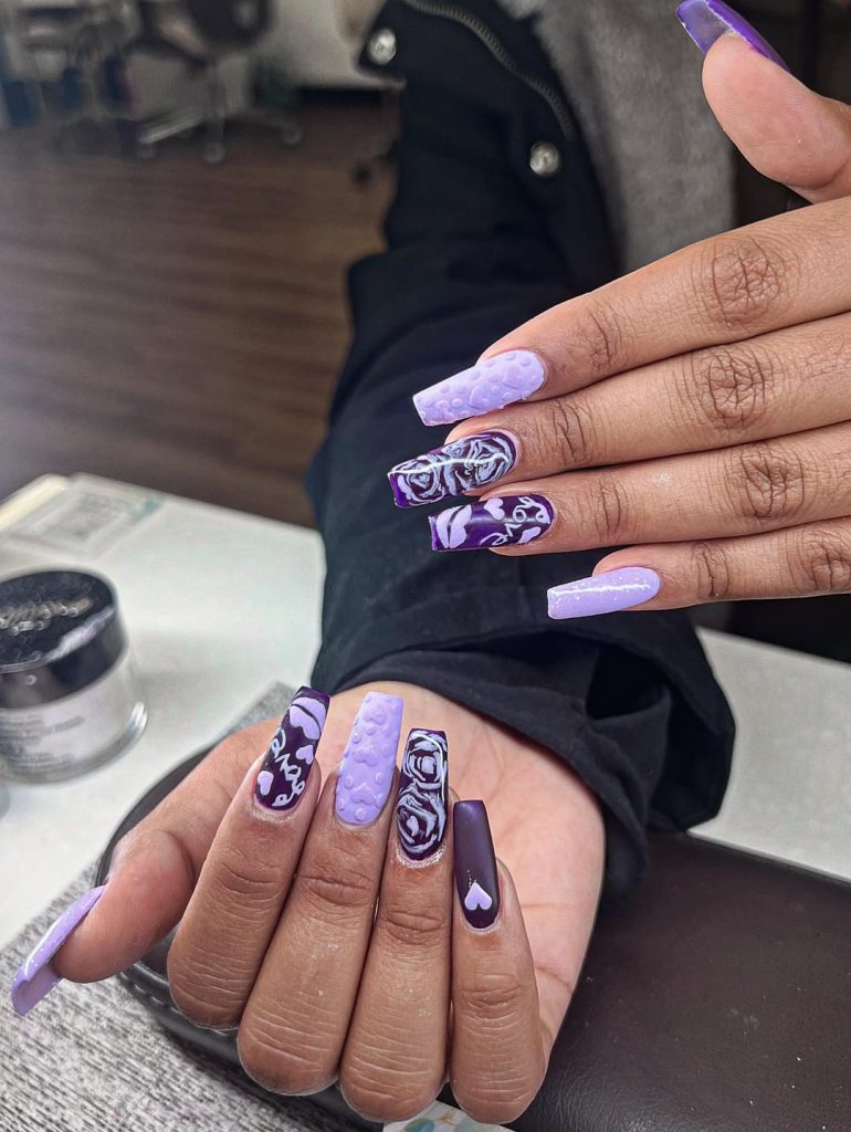 If you enjoy variety but want cohesion, this layout is a wonderful choice. The mixed design works best on medium-length almonds or rounded shapes where there’s enough space for artwork without crowding. Keep the color palette consistent in soft Purple shades so the look stays polished rather than busy. It’s Fun without sacrificing sophistication.