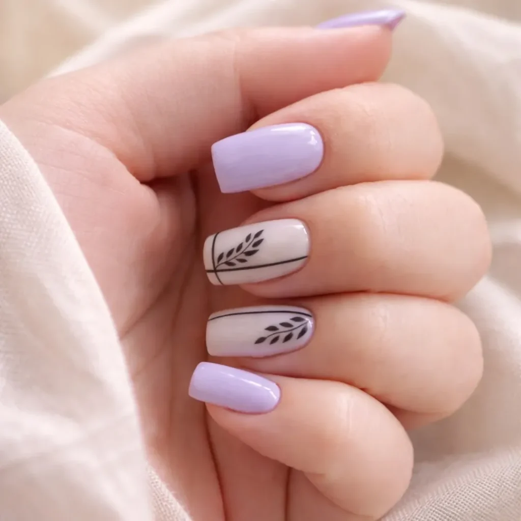 27. Simple Lavender Almond Nails with Minimal Black Leaf Design