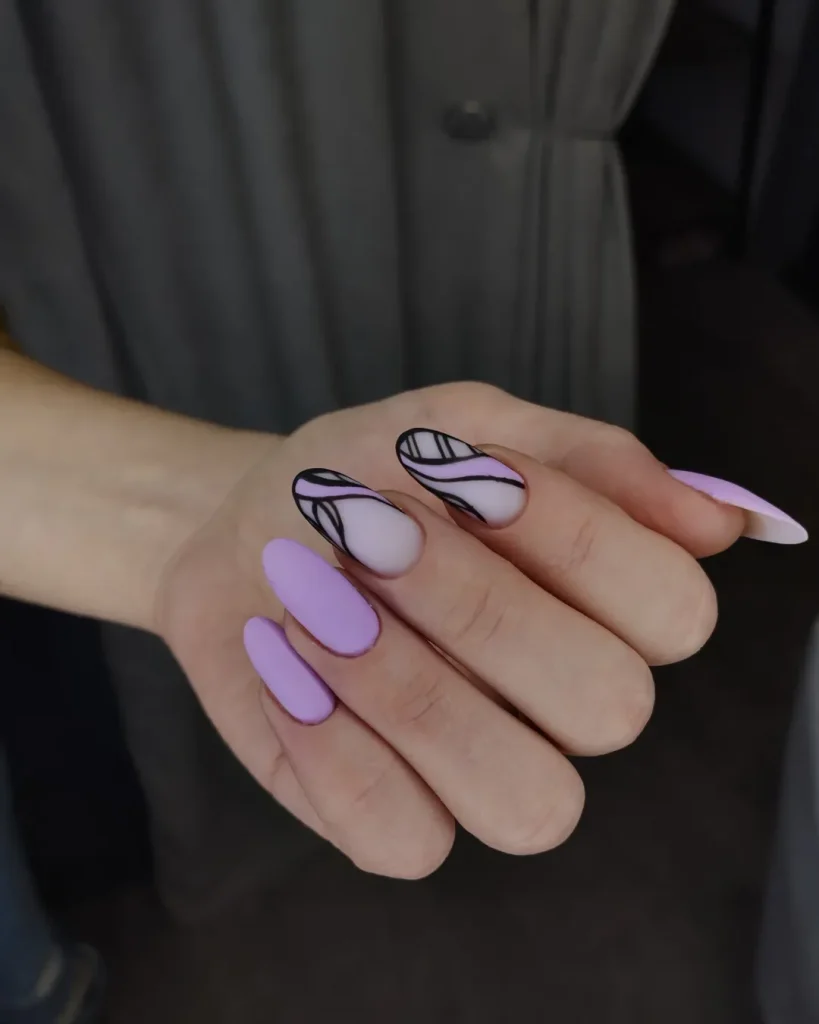 Now this is where lavender gets a little daring. The soft purple base, paired with bold black artwork, creates a striking contrast that instantly feels fashion-forward. The Almond shape keeps it feminine, while the graphic with design detail adds edge and personality. It’s not your typical Cute spring manicure—it’s confident, expressive, and full of 2026 attitude.