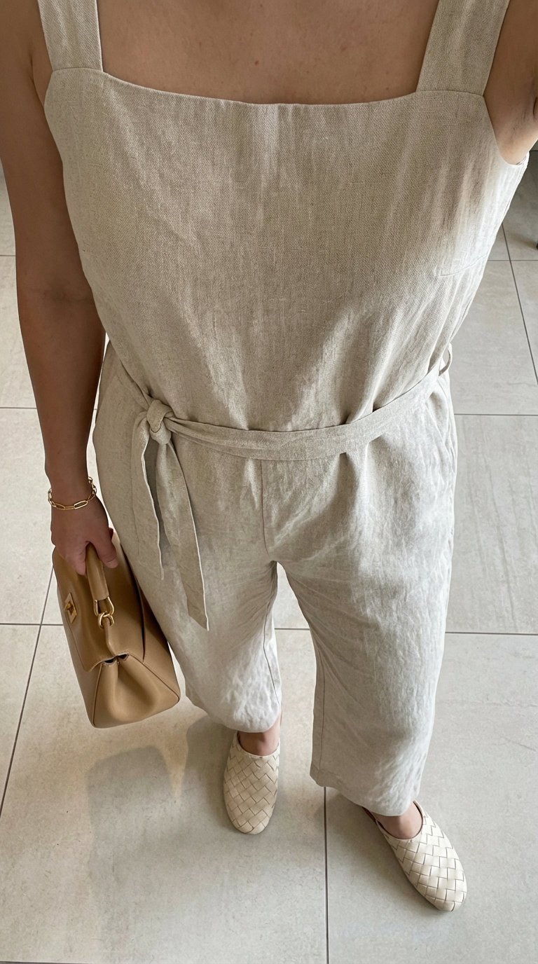 Our wear test confirmed the jumpsuit’s practical appeal; it remained surprisingly wrinkle-free after four hours of brunch and a casual walk, a notable quality for any linen garment. This outfit perfectly captures a chic, effortless vibe that translates well to Pinterest inspiration boards, with the clean aesthetic making it highly shareable. The harmonious blend of beige, cream, and gold tones creates a sophisticated warmth, making this a go-to choice for a weekend brunch or casual daytime date.