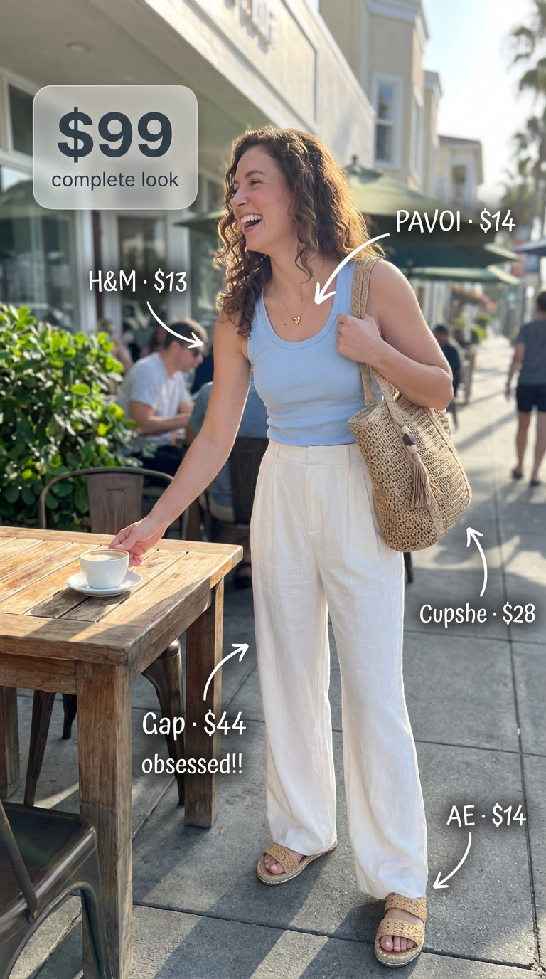 The verdict is that this outfit perfectly captures the ‘Coastal Linen Dream’ aesthetic, making it highly repinnable for Pinterest audiences seeking aspirational yet achievable styles. The mix of accessible and premium brands adds to its broad appeal. For a complete beach-ready look, a fantastic styling tip is to accessorize with a wide-brimmed straw hat and oversized sunglasses to lean into the calm, sun-drenched mood.
