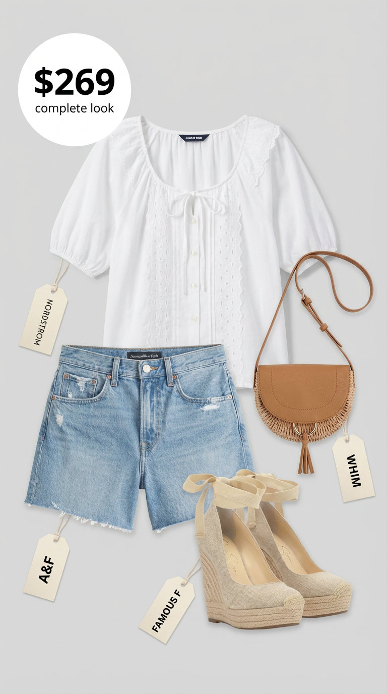 Speaking of which, simplifying for a weekend getaway creates some of the best summer outfits for ladies. This fresh and earthy look pairs a crisp white cotton voile top ($59.95) with light-wash denim shorts. The top’s puff sleeves and delicate embroidery add bohemian charm, while the canvas and jute espadrille wedges ($99.99) provide walkable height for a day trip. The combination of airy fabrics and natural textures feels both playful and cohesive.