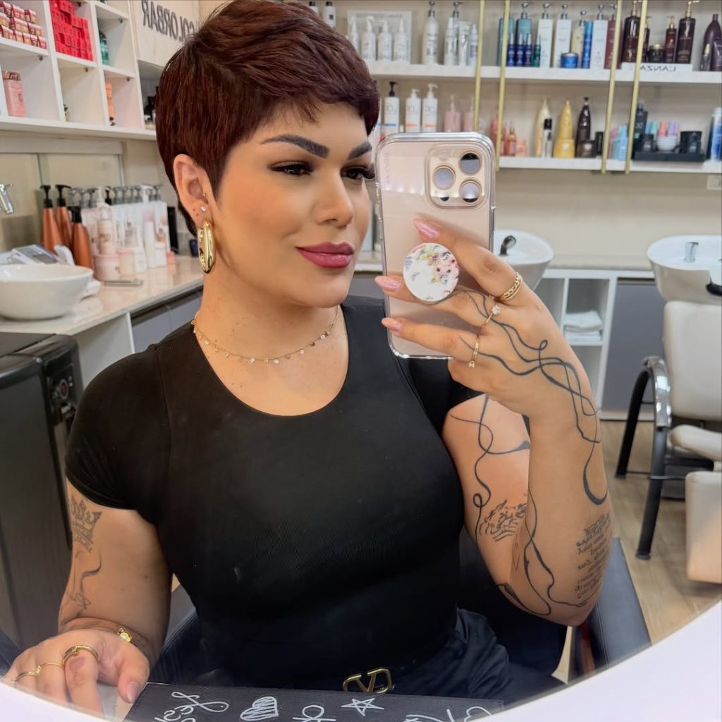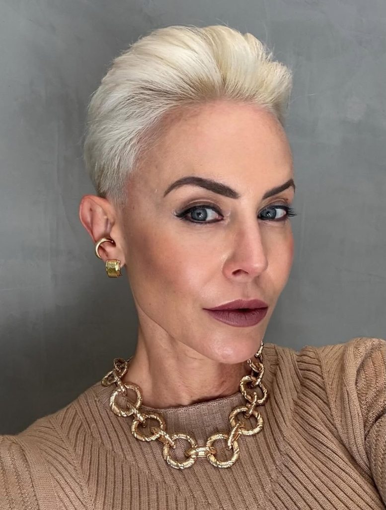 This pixie feels like a deep breath and a fresh start. The icy blonde tone paired with a super short length conveys off a clean, confident energy that feels modern without trying too hard. It has that quiet power—the kind that doesn’t need volume or drama to stand out. There’s something effortlessly Feminino about how the texture softens the overall look, making it feel polished but still very human and approachable.