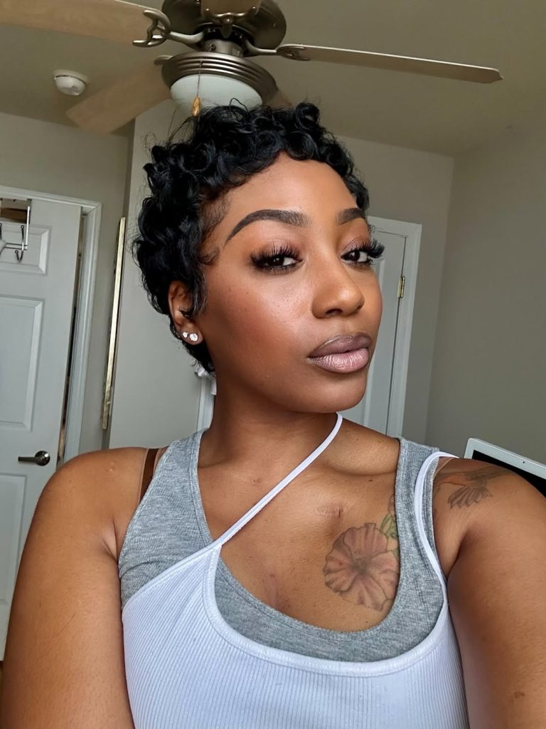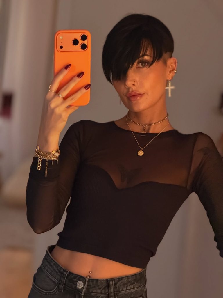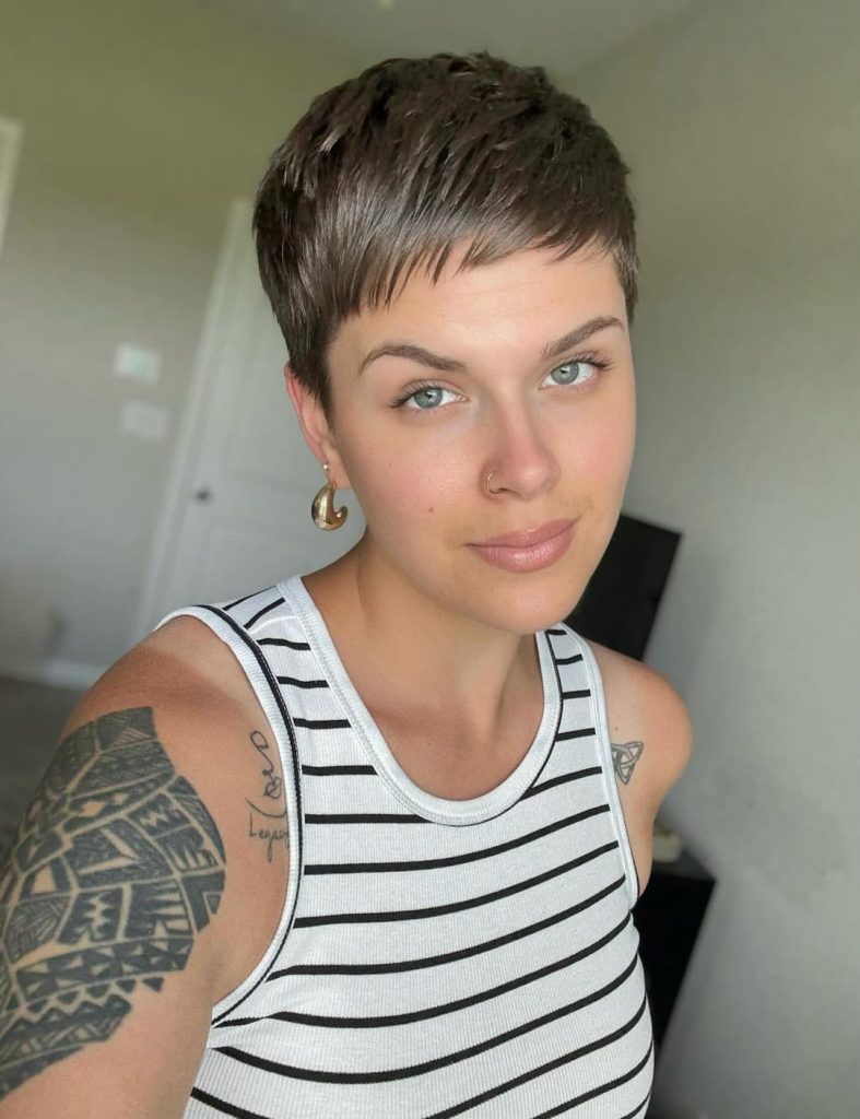 This pixie cut exudes pure attitude in the best way possible. It’s so smooth, and the close crop gives it a striking silhouette that feels fashion-forward and confident. It has a strong, editorial vibe like something you’d see on a runway, yet it feels wearable.