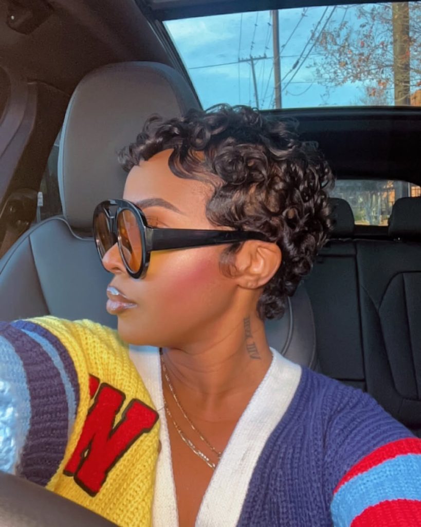 The magic of this pixie and its quiet strength is so grounded and real. The short, tight, curly pixie reflects facial features super naturally and creates a look that is confident without being loud. This gives her a sense of ease, as if she is a strong, feminine woman who knows herself well.