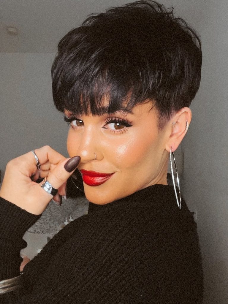 There’s something irresistibly adorable and sassy about this pixie. The soft fringe frames the eyes beautifully, giving the face a gentle, approachable feel while still keeping things playful. It’s the kind of haircut that feels friendly and stylish at the same time, perfect for women who want a fresh look without going too extreme. The balance between softness and structure makes it incredibly wearable.