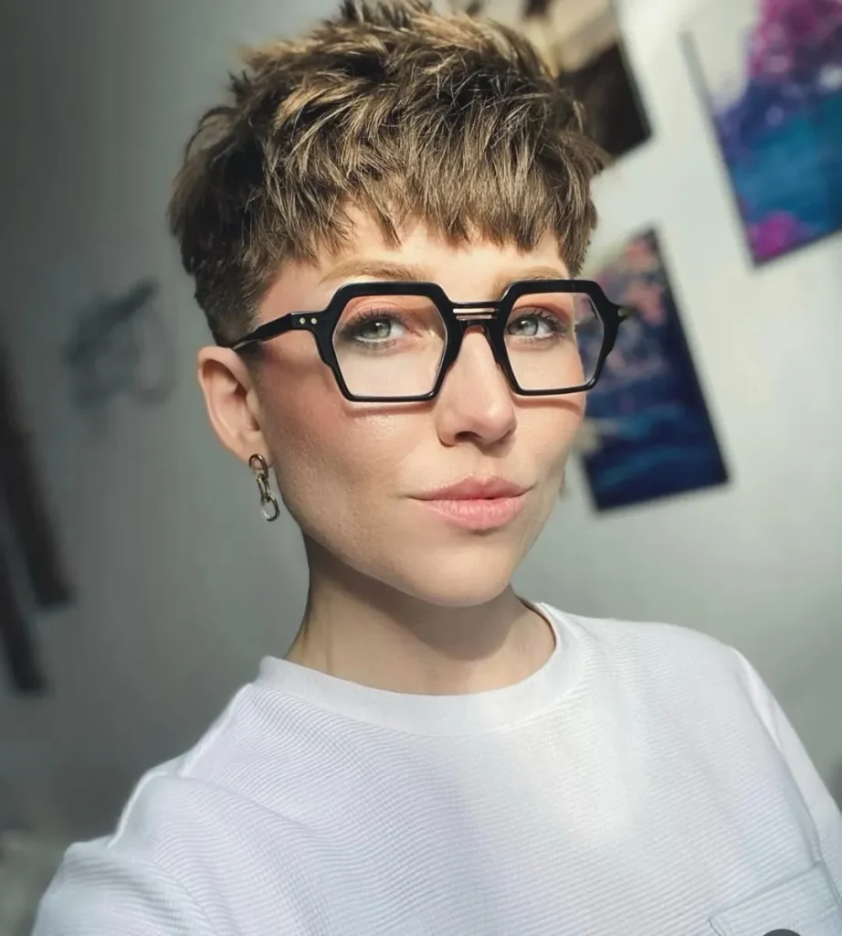 This pixie has personality written all over it. The slightly messy texture and soft fringe bring a playful, creative feel that feels modern and relaxed. It’s not trying to be perfect—and that’s precisely what makes it charming. Paired with glasses, it feels artsy and confident, like someone who knows exactly who she is and isn’t afraid to show it.