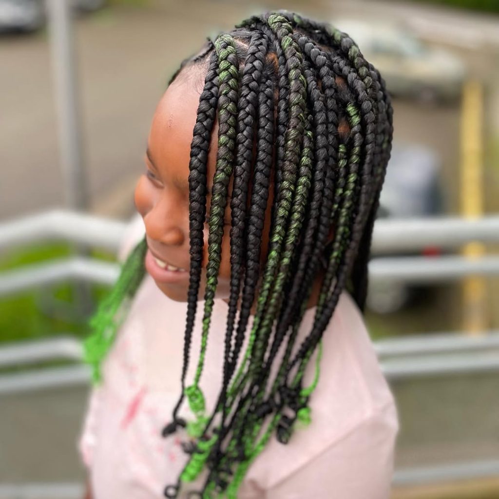 There’s something so fun about adding a pop of color to classic braids. The mix of deep black and vibrant green woven through these short braids of kinky curly lengths feels playful without being over-the-top. It has that youthful spark but still looks neat and intentional. The shorter length frames the face beautifully, giving it a light, bouncy energy that feels fresh and confident.