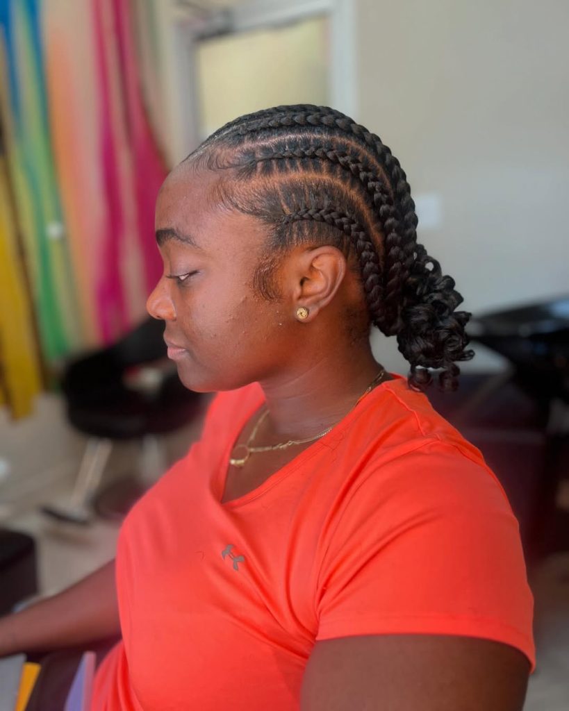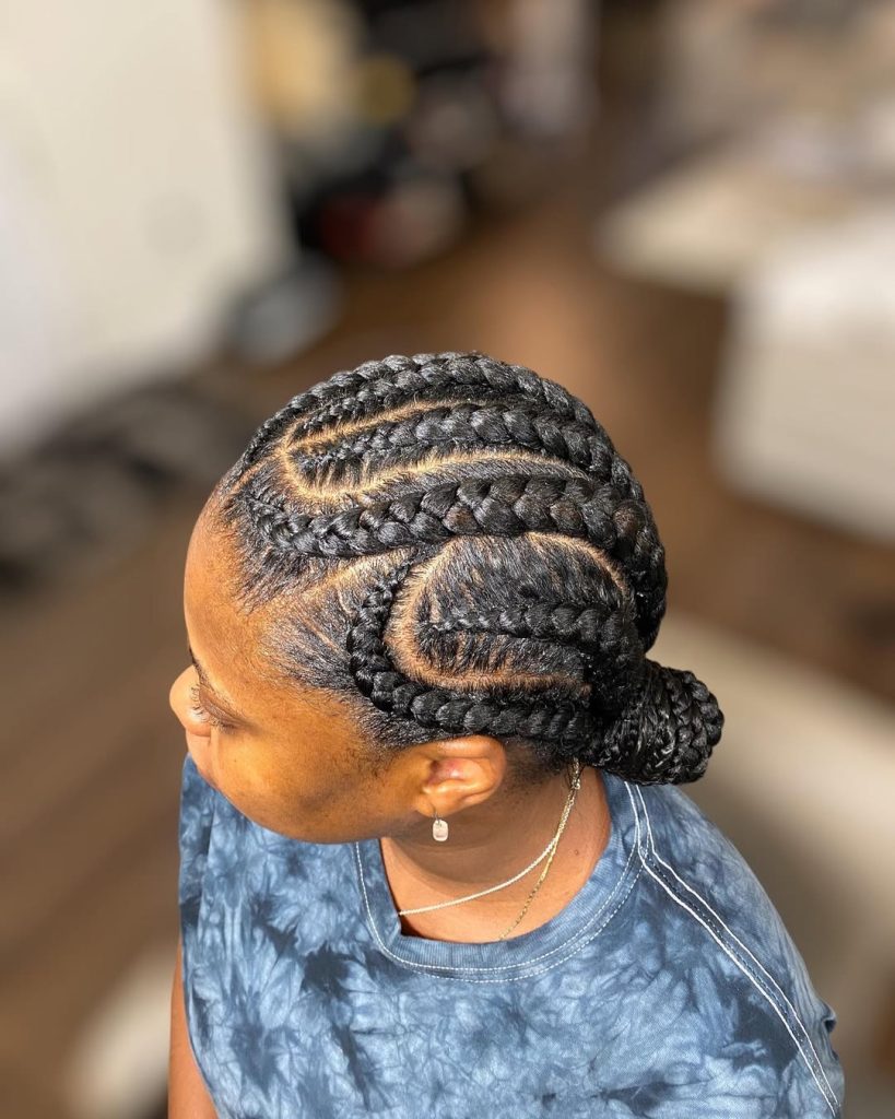 If you love a style that feels graceful yet strong, this braided updo delivers. The curved Braids cornrow pattern flows into a neatly tucked bun at the nape, creating a silhouette that feels refined and timeless. It’s protective styling that looks intentional and sophisticated—perfect for moments when you want your hair off your face but still beautifully styled.